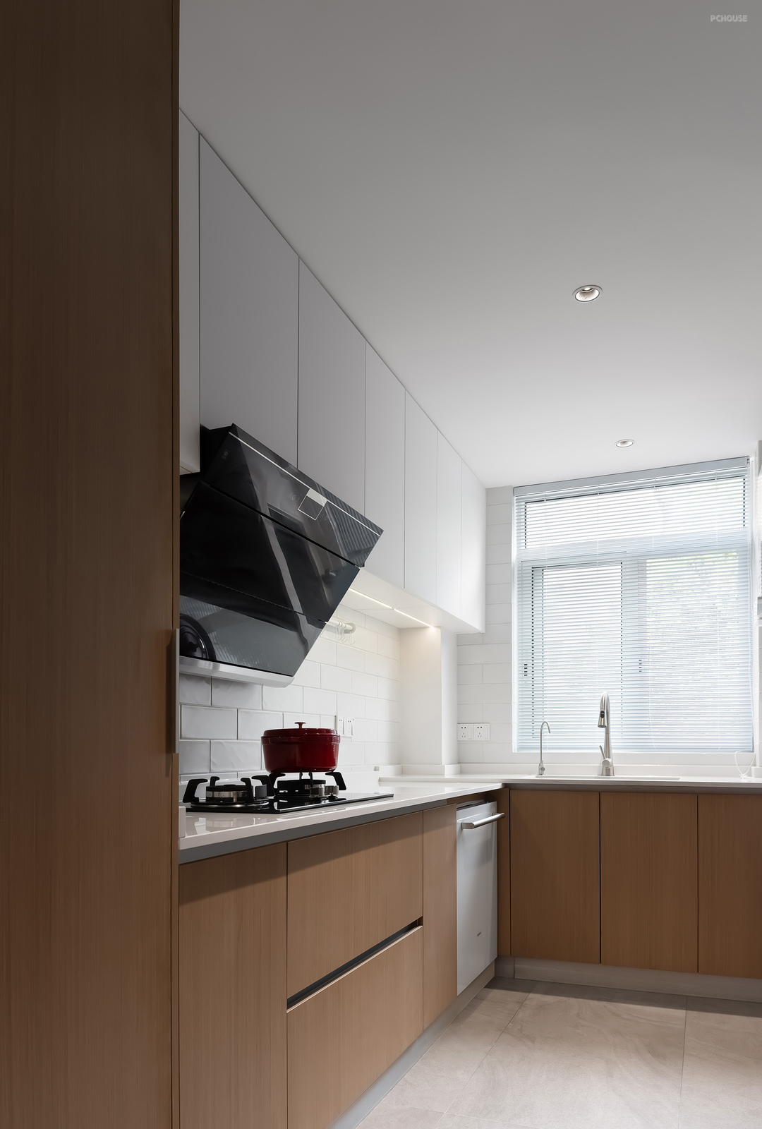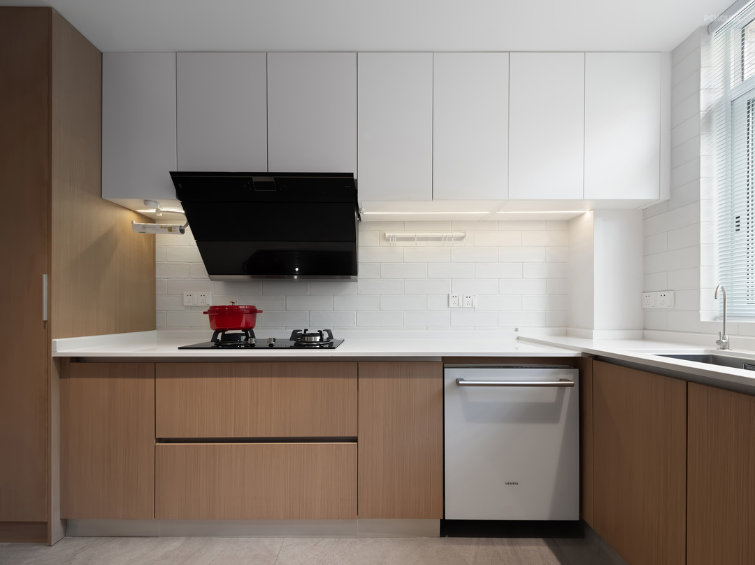 厨房的下柜延续了客厅餐厅的木纹肌理,而吊柜与墙砖大面积的白色提亮了整个空间。