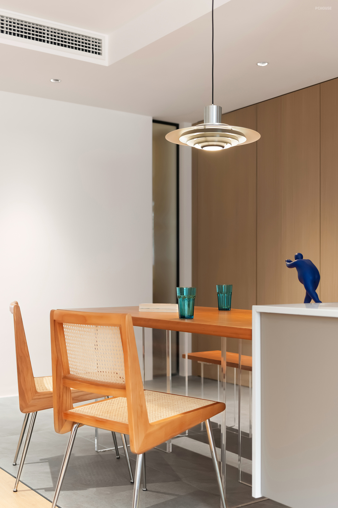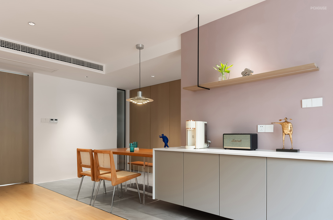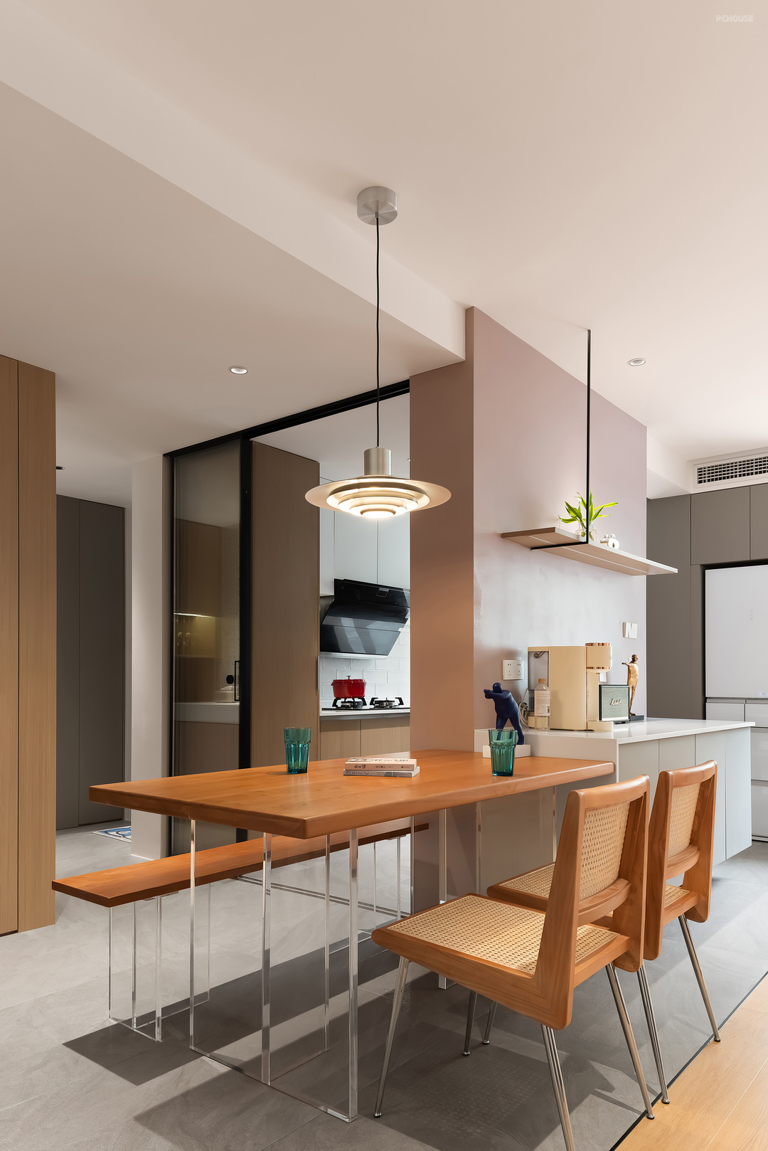 我们在厨房与客厅的隔墙外侧设计了一组餐边柜,餐边柜的一侧又连接着餐桌,让整个餐厅的洄游动线更加流畅。