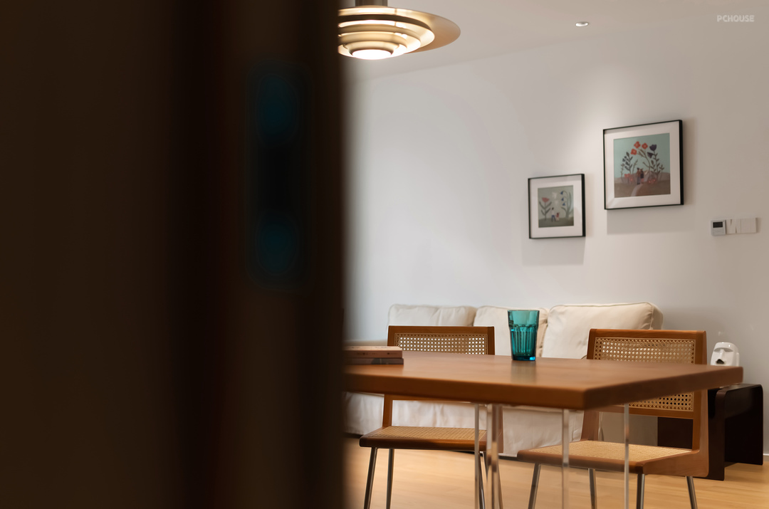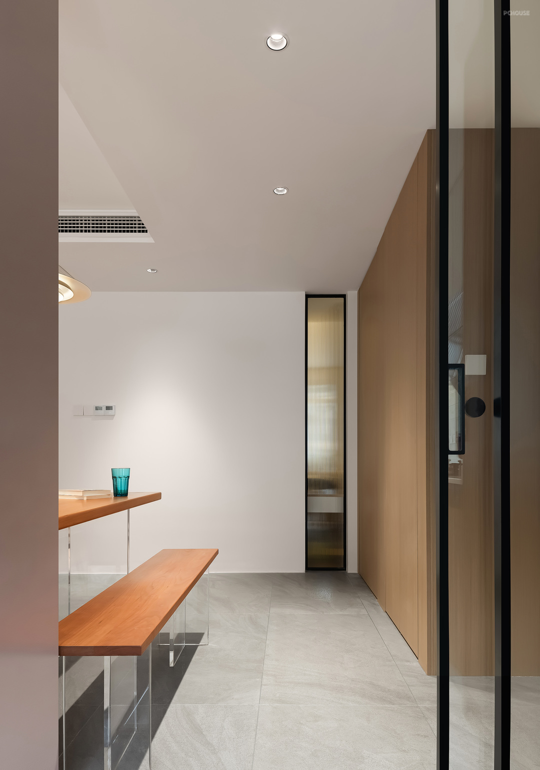 从厨房透过长虹玻璃的隔断,隐约可以看到对面的卧室,也间接地为餐厅补光。