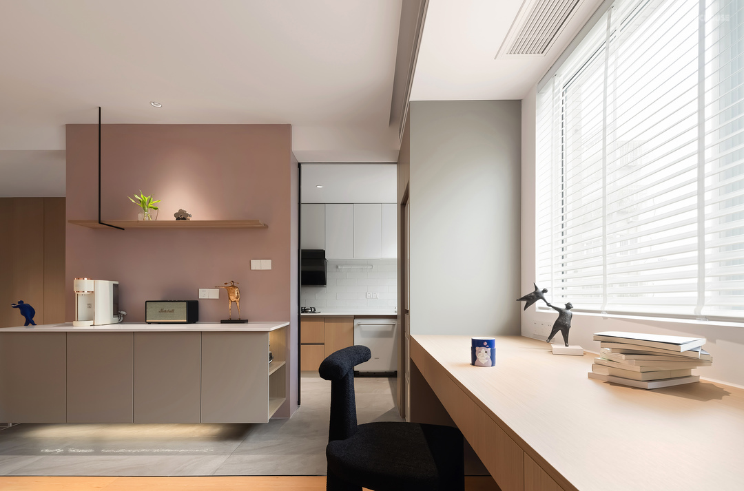 书桌的另一侧紧挨着厨房,原先的厨房空间狭小,冰箱很难融入其中,我们利用书桌的深度将冰箱及收纳柜向外延伸,使厨房和书房相连接,整体拉伸了空间的纵深感,为了避免油烟问题,我们用一扇玻璃移门将两个空间阻隔开,既满足日常实用性也保留其美观性。