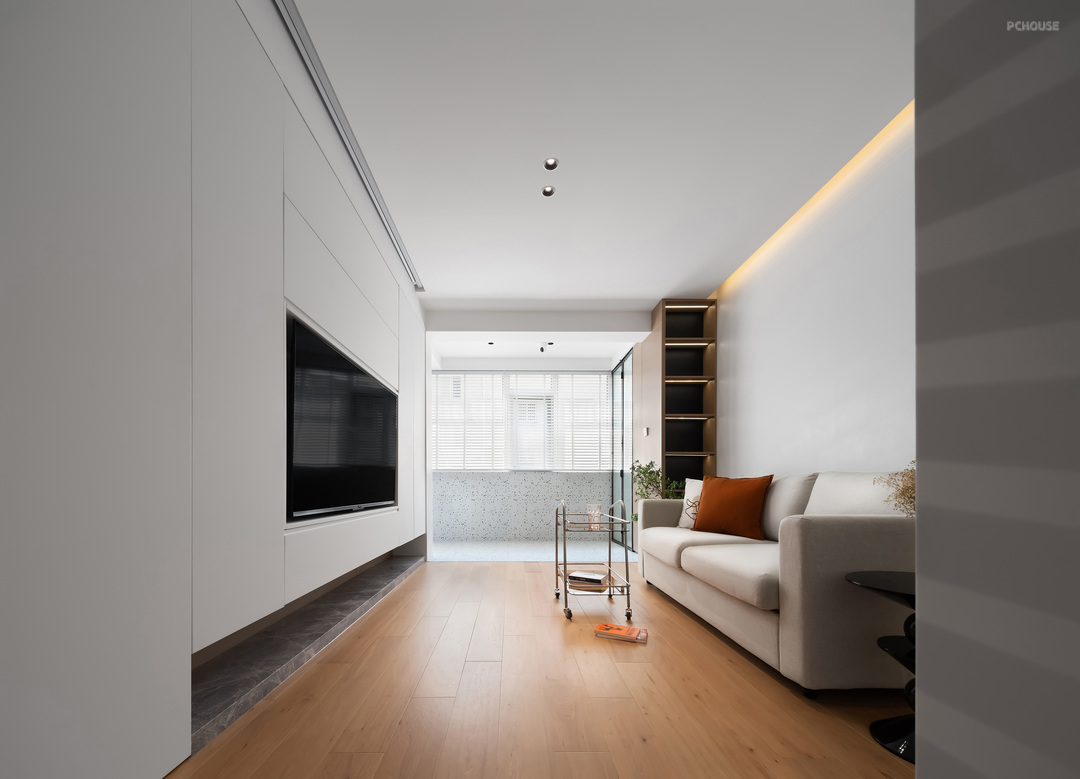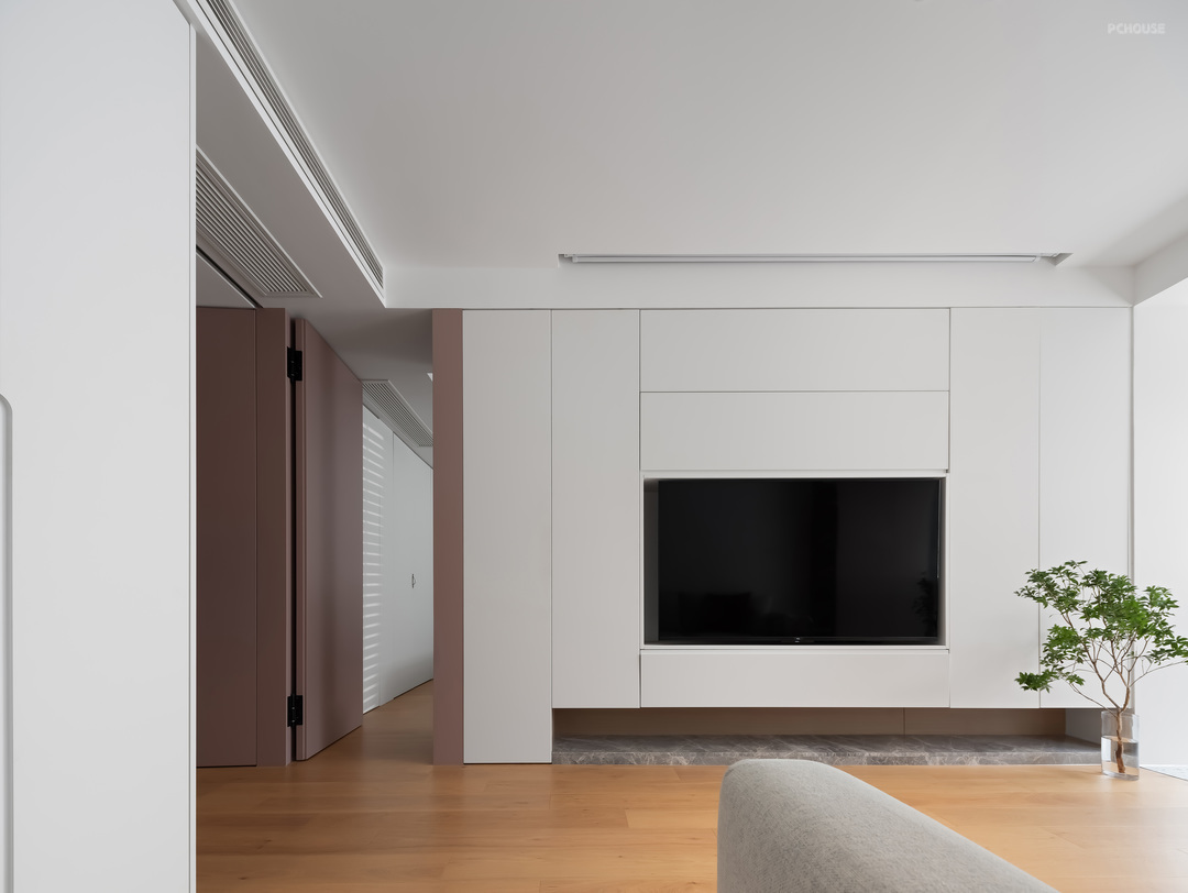 4:扩大中间南卧的门洞,用移门取代传统房门,我们将这个空间设定成多功能房,在这个空间中我们将投影和电视组合在一起,用沙发床取代传统双人床,在功能上,让空间可以任意切换场景,当移门关闭时,此处可以作为影音室、客房,当移门打开时,此处可以作为起居室。在空间的功能上我们实行了多种可能,让空间不再单一。