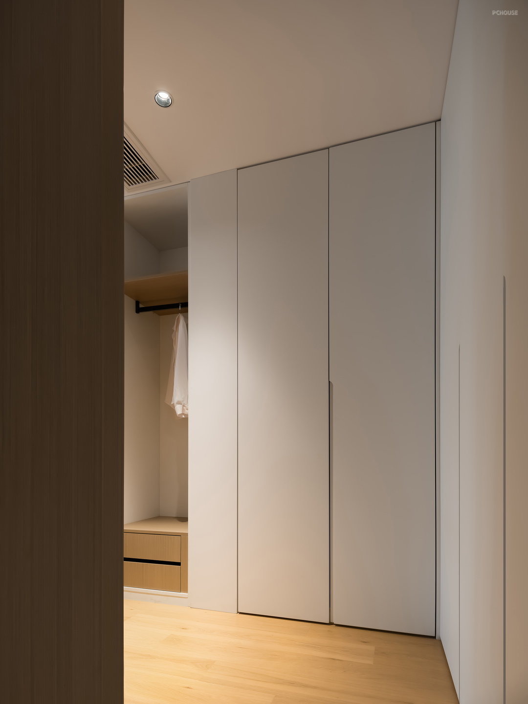 我们利用墙垛的厚度在主卧的门口处设置了一组衣帽柜,以此来补充主卧空间收纳的不足,而且在靠近床边的位置设计了部分开放格,为隔夜衣物提供了收纳空间。