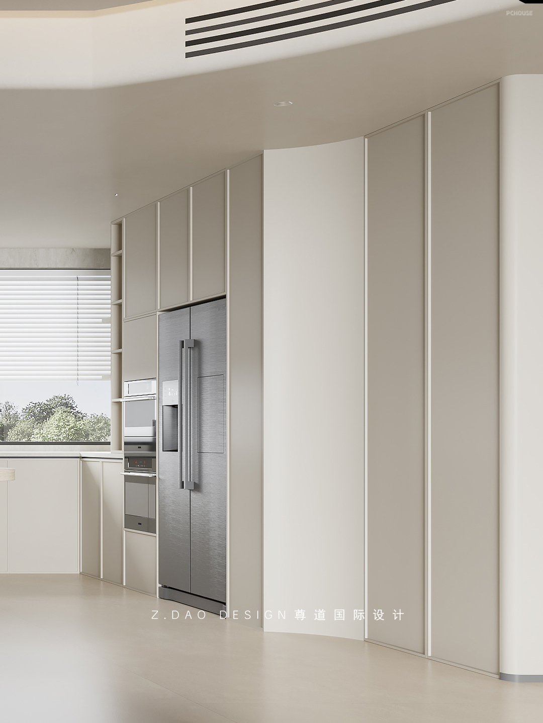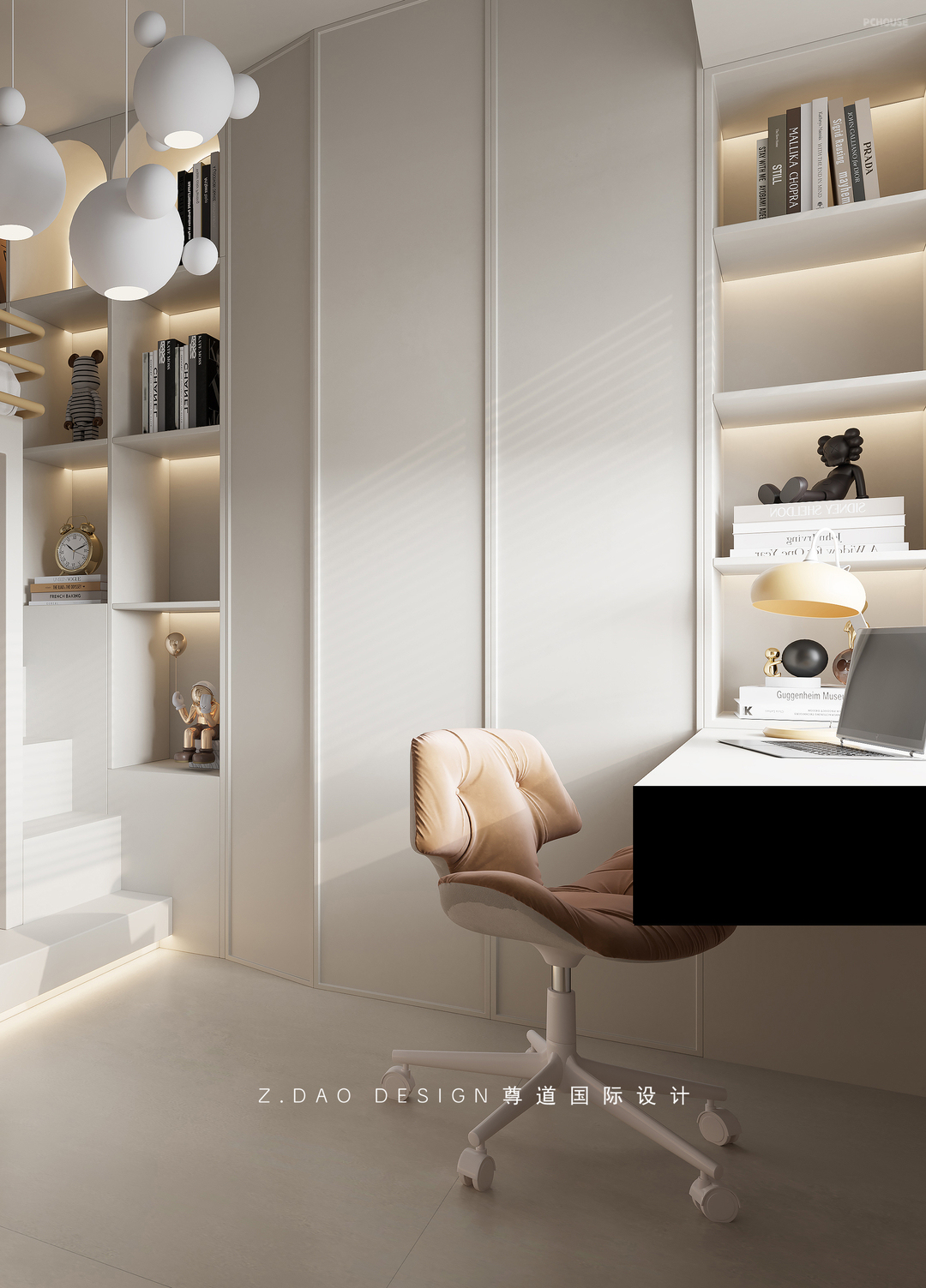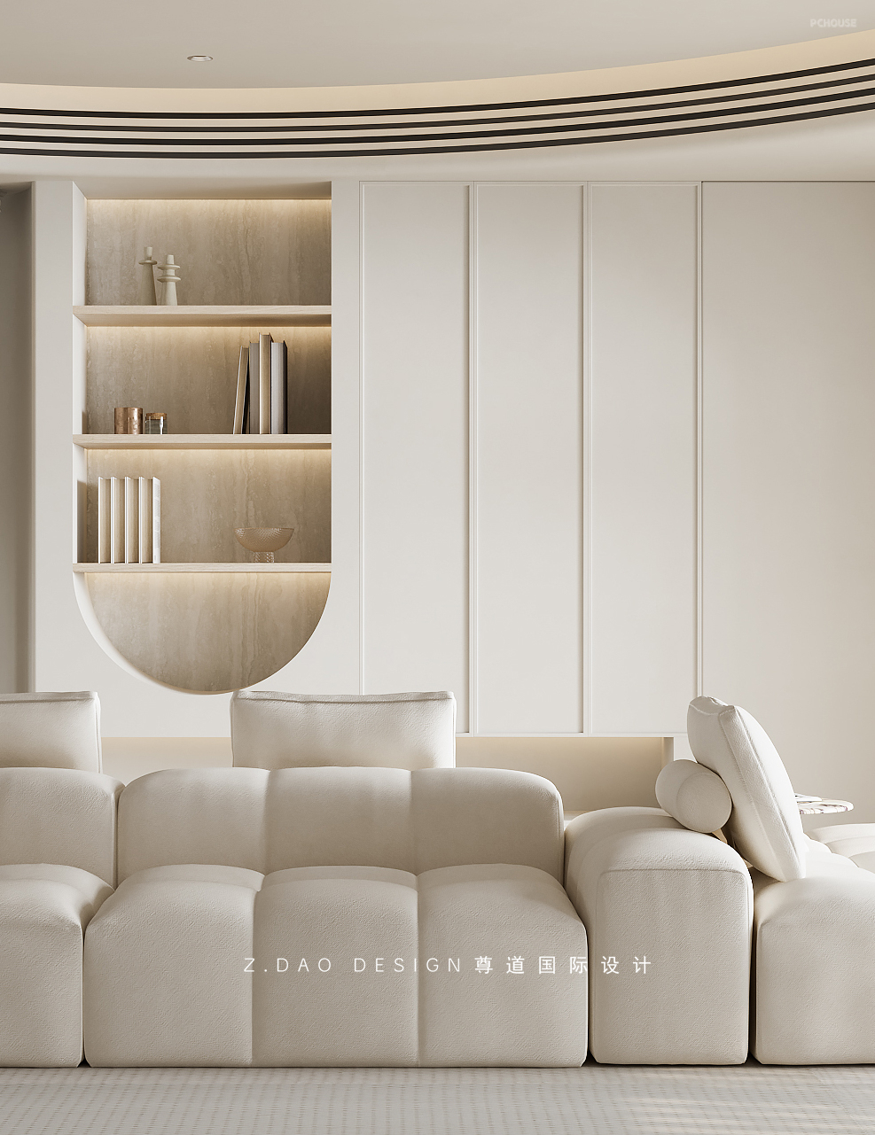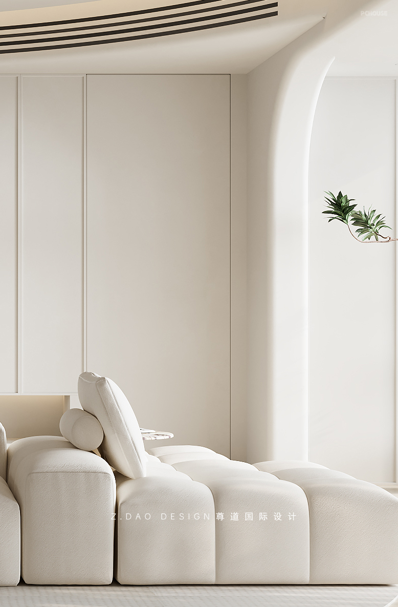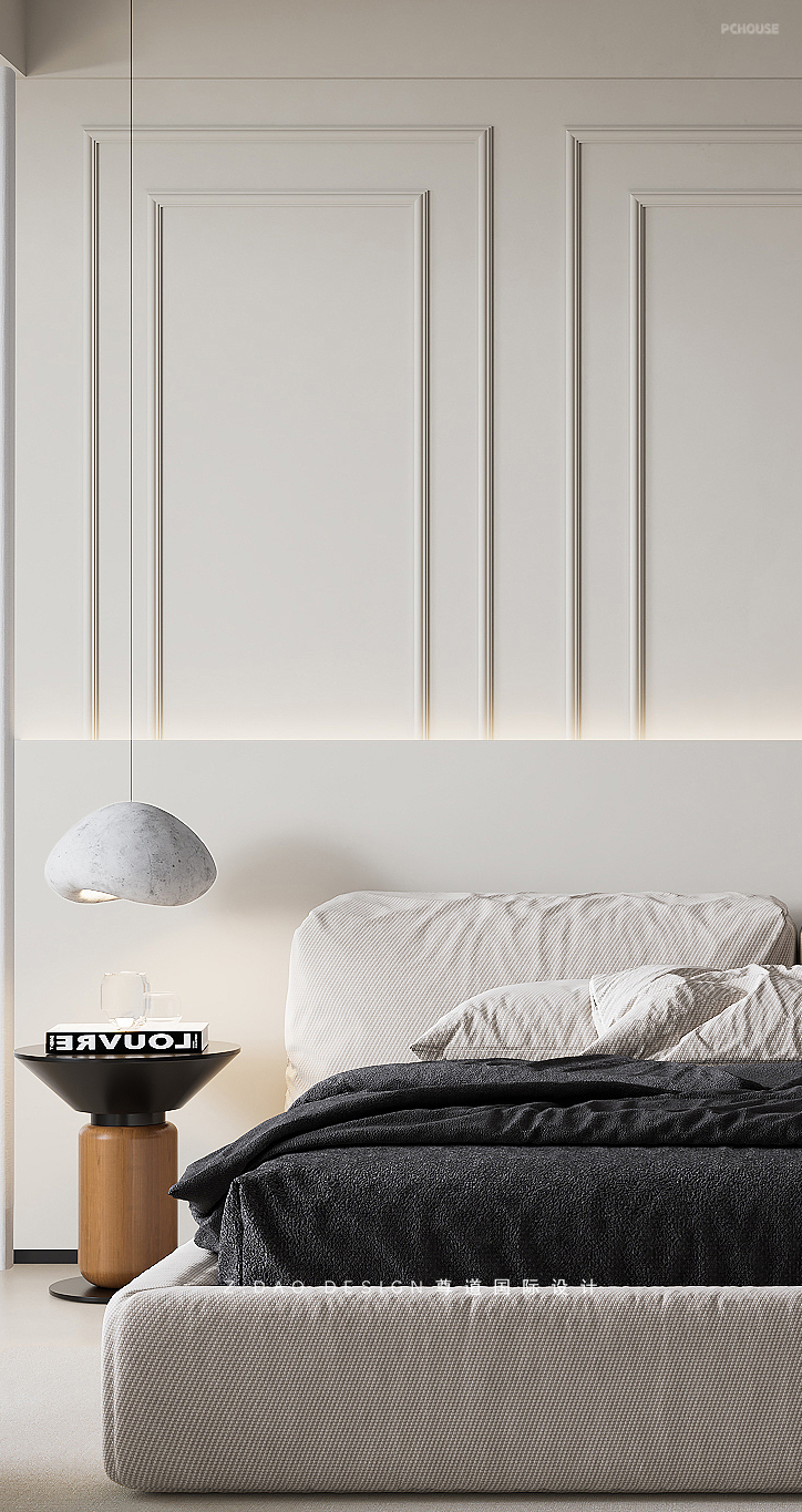 护墙板搭配顺滑柔美的PU线条形成立体的美感,空间交织,协调出柔和的气氛。