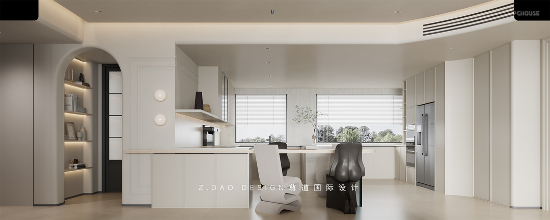 4、厨房做成开放式,分为中西厨,且与餐厅相结合,与客厅连接,形成客,餐,厨的超大客厅;