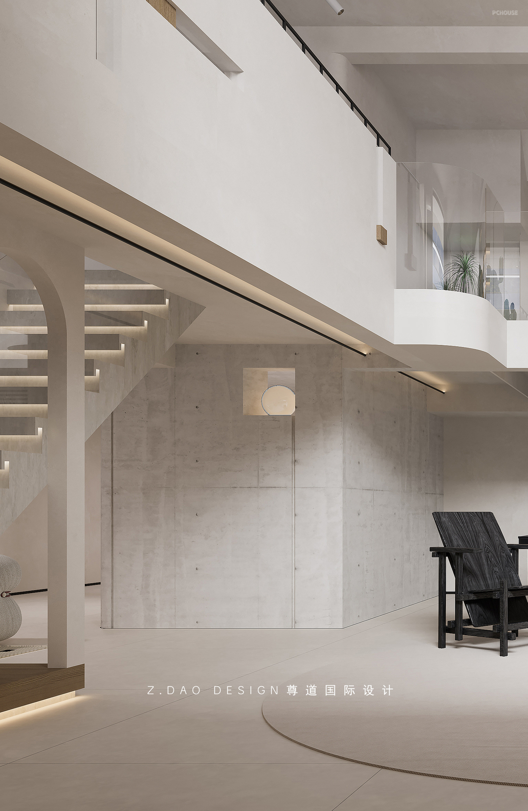 加宽的承重墙通过巧妙地立面手法将其弱化。负一楼的卧室探出一点观景台,让人忍不住驻足欣赏这空间之美。以最简洁设计手法打造富有节奏的空间美感。