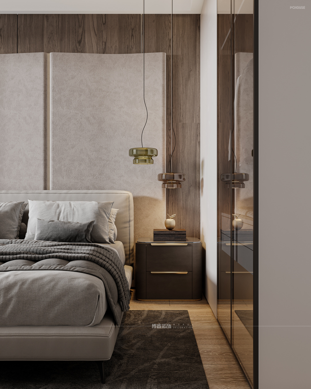 灰与木色延伸至卧室温润了整体空间氛围,软装设计都尽量选择与空间色系相近的原木家具,保持了空间的整体性和协调性, 利用吊灯的点缀,又赋予了卧室新的氛围。