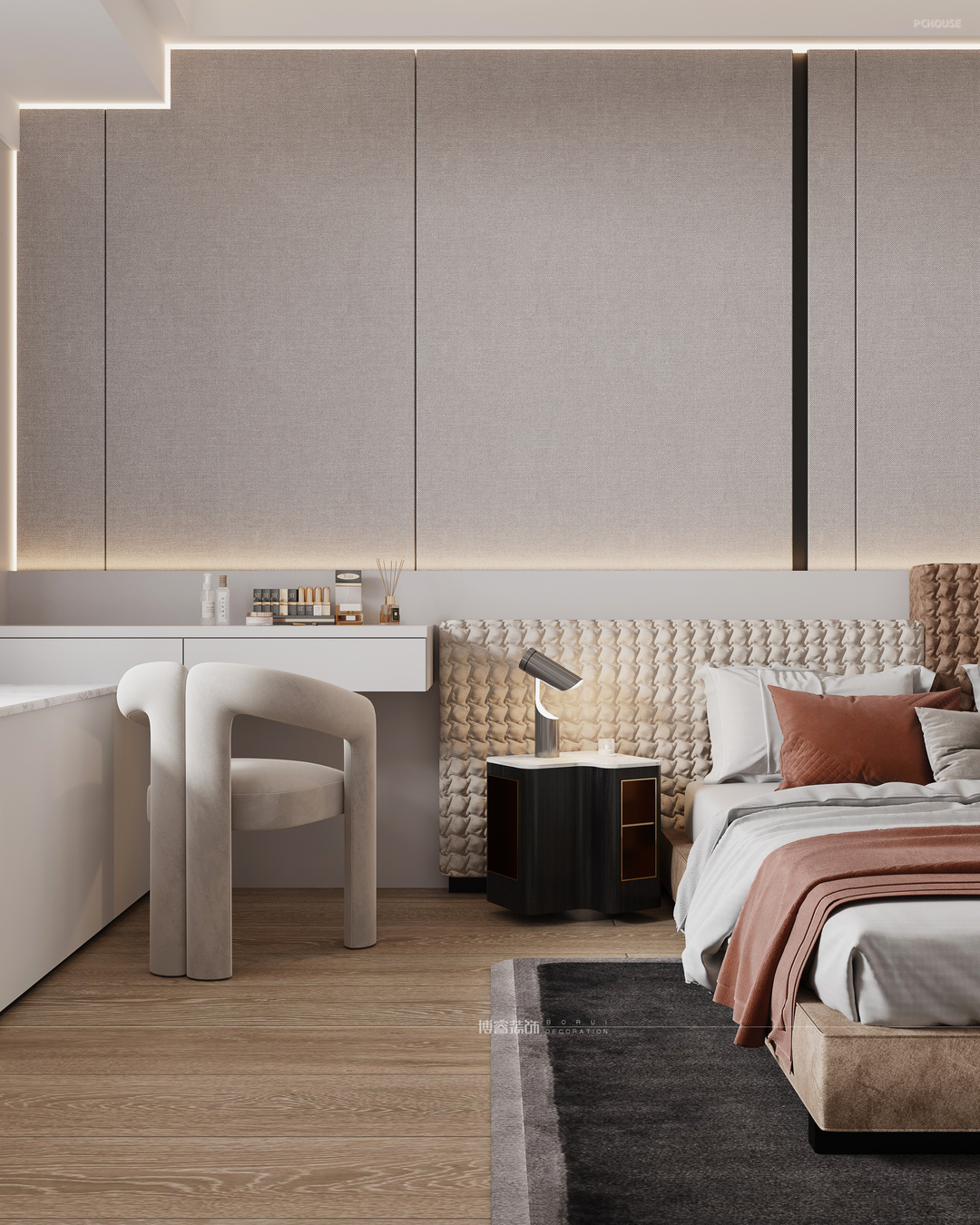 暖咖色搭配作为视觉主调,拼接的床背设计提升整体的设计感,质感又沉稳,柔软又温和。无主灯的设计,烘托着静谧舒适的生活情调,可以治愈一天工作疲惫。
