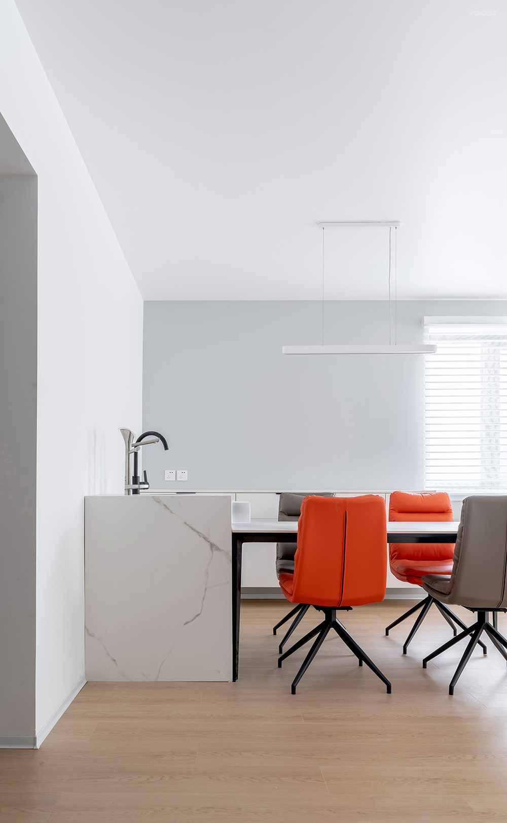 客餐厅空间整体色调,相对协调淡雅。橙黄色的餐椅配色,起到了活跃空间,泛起涟漪的质感。