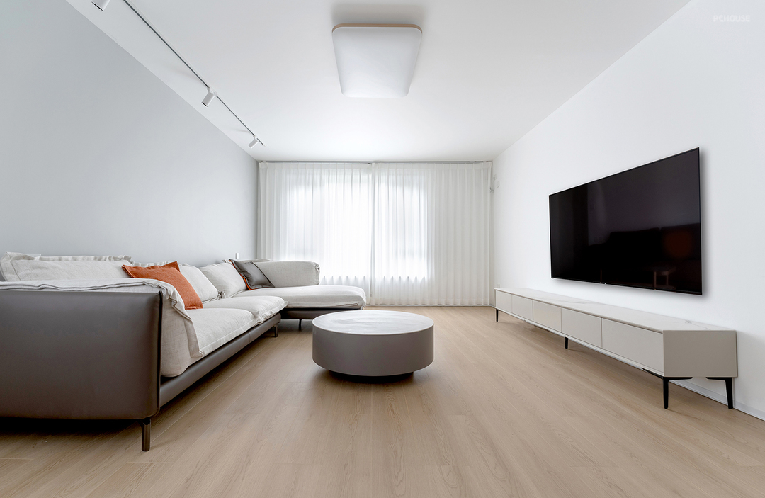 回归空间的本质,客厅没有过多的装饰,以白色,原木色,浅灰色为主色调,达到一种宁静祥和的氛围。