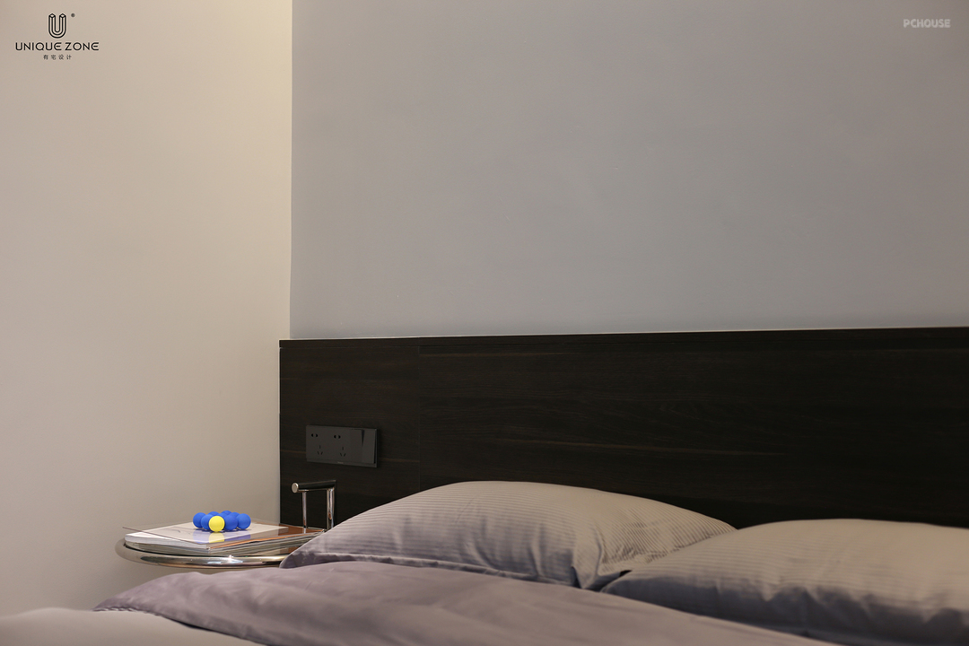主卧意在营造简单助眠的就寝空间,床头延用客厅的深色木质做了低矮造型,购入无靠背床架,既让床尾空间更宽敞,木质也增加卧室的质感。