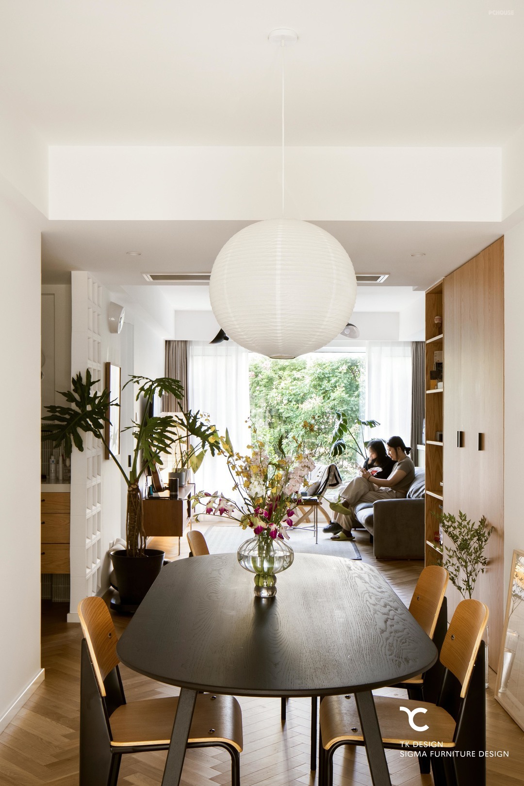 餐桌上方吊灯造型别致,圆润的造型搭配暖色系的光,直接提升空间的气质与设计感。