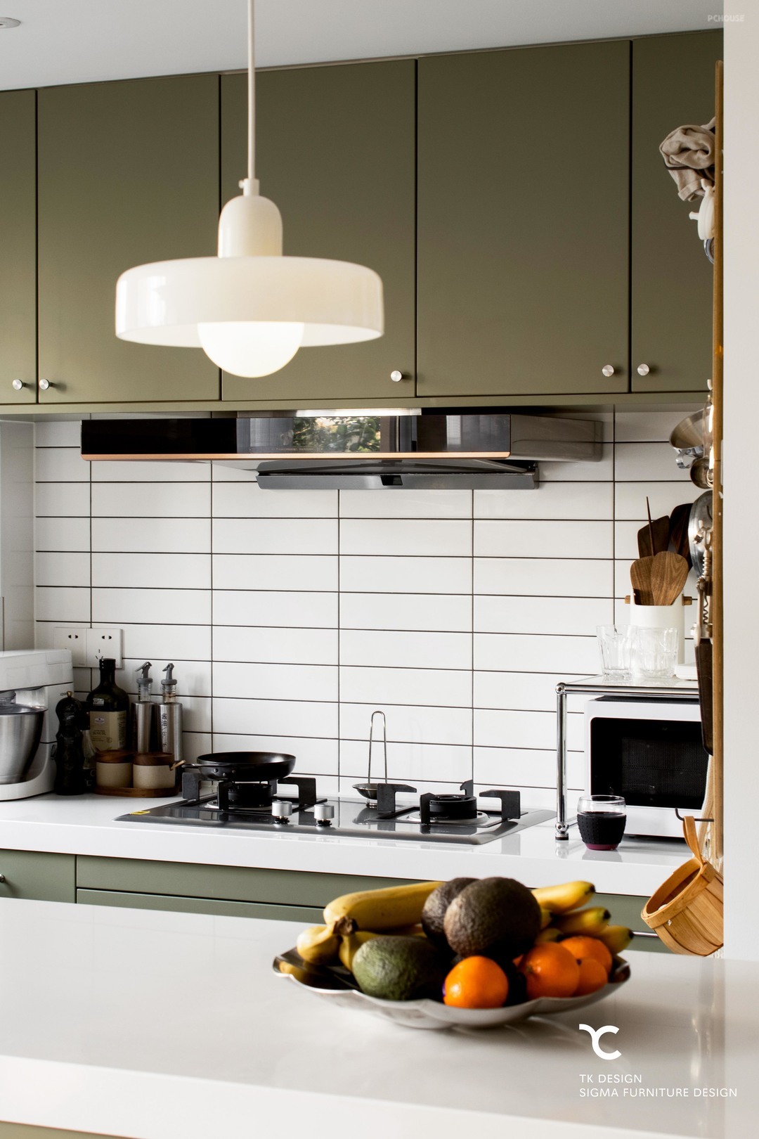 中厨及岛台采用白色大理石台面,简约干净;上下柜体则采用复古绿,高级且有质感,一股清新的气息扑面而来,下厨的心情也跟着愉悦起来。