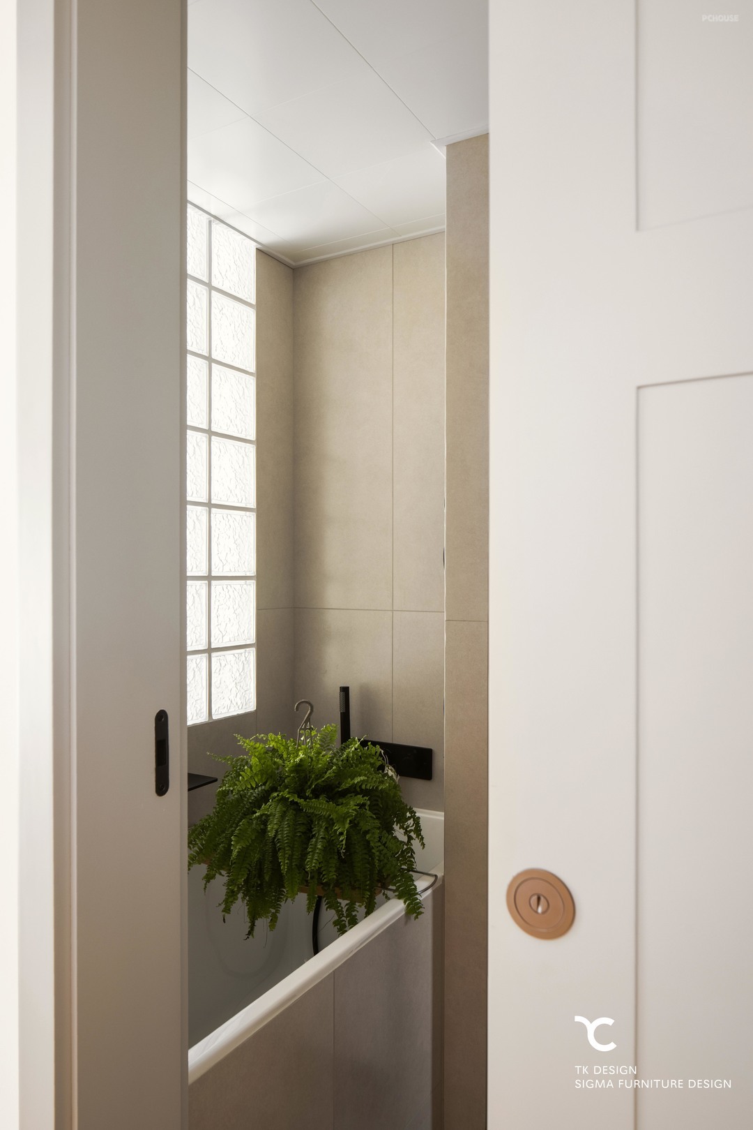 卫生间是半开放式,以镂空砖作隔断,实用又养眼;悬空的原木洗漱台,线条简洁,质感在线,方便日常清理;白色大理石台盆搭配牛油果绿方砖,配色清新又自然;