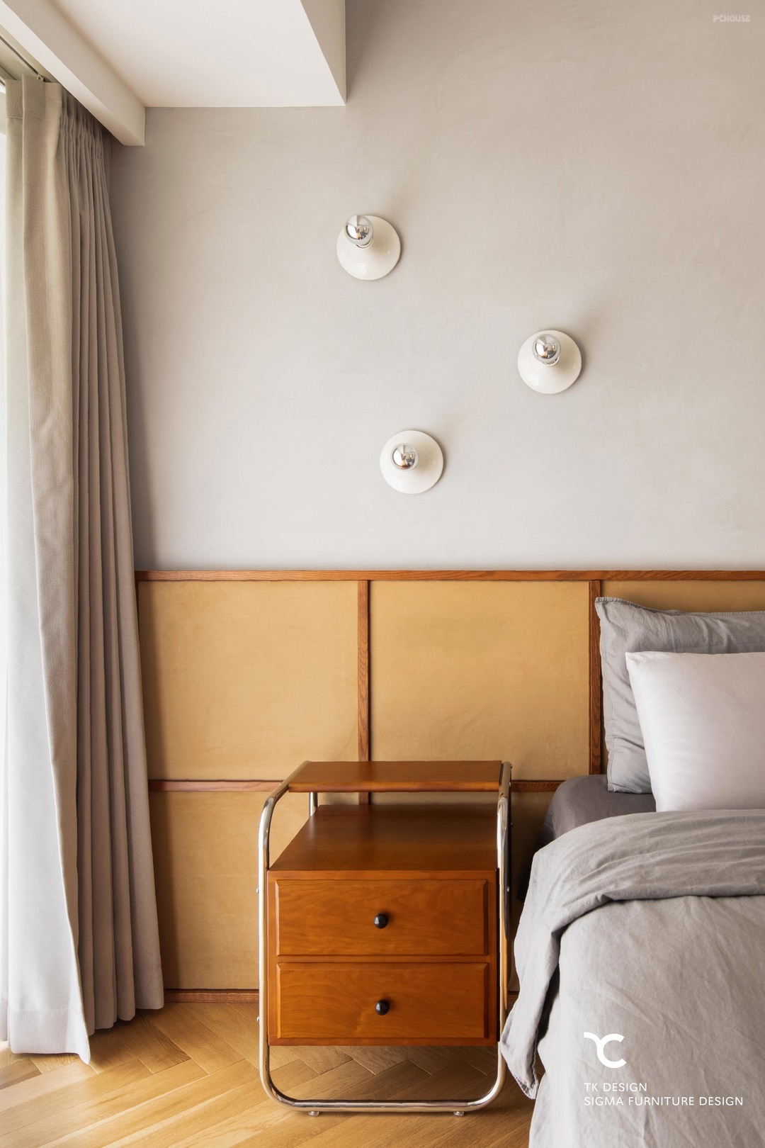 床头胡桃木色中古家具与棕色调床头背相呼应,散发出怀旧复古的氛围感;