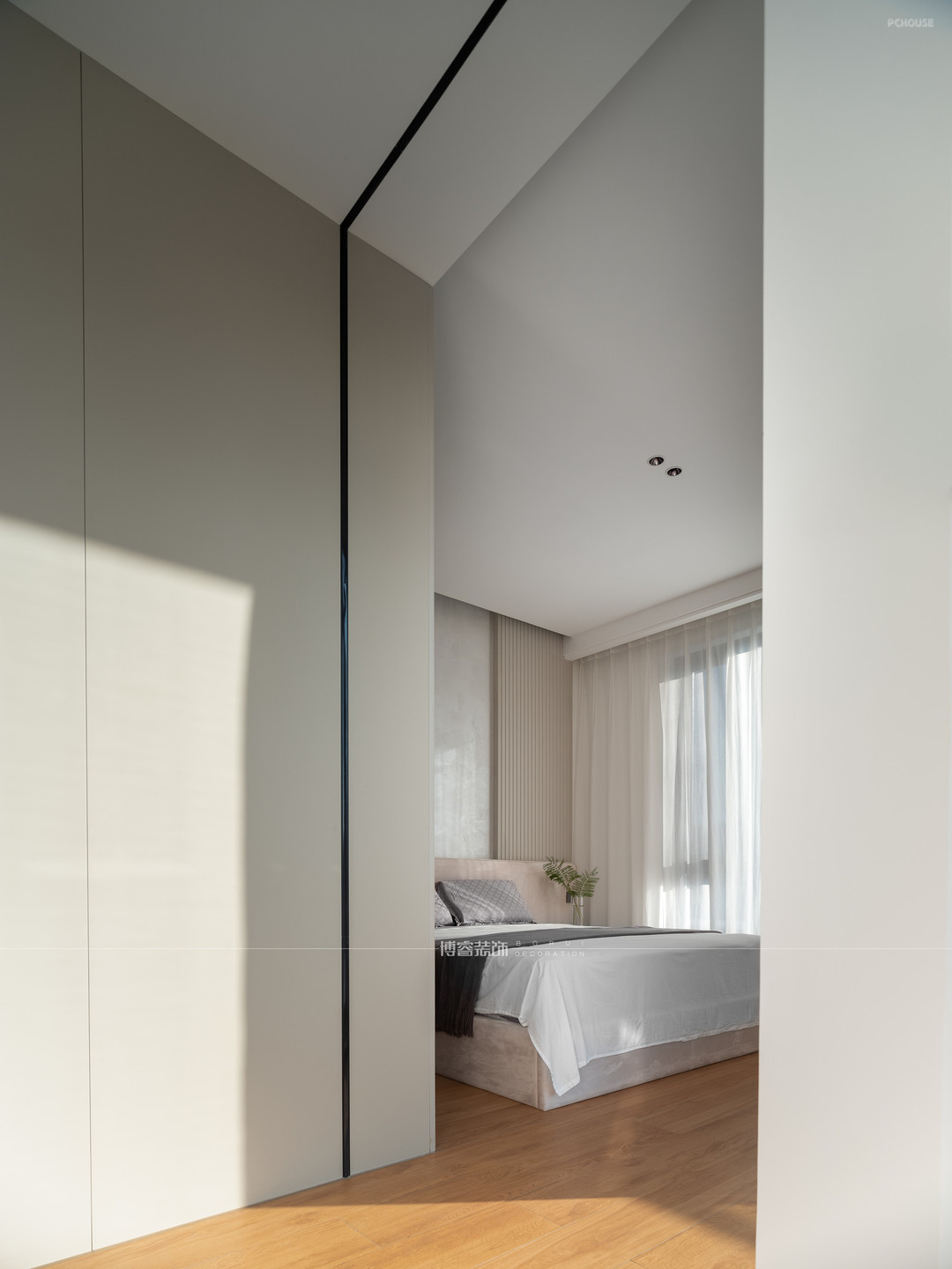 六楼卧室以素雅的色调、简单的线条渲染出整个空间的舒适,而房门正对床头左侧,整个床头设计会往右移,卧室的色调与整体一致,搭配木质地板,恬静自然。