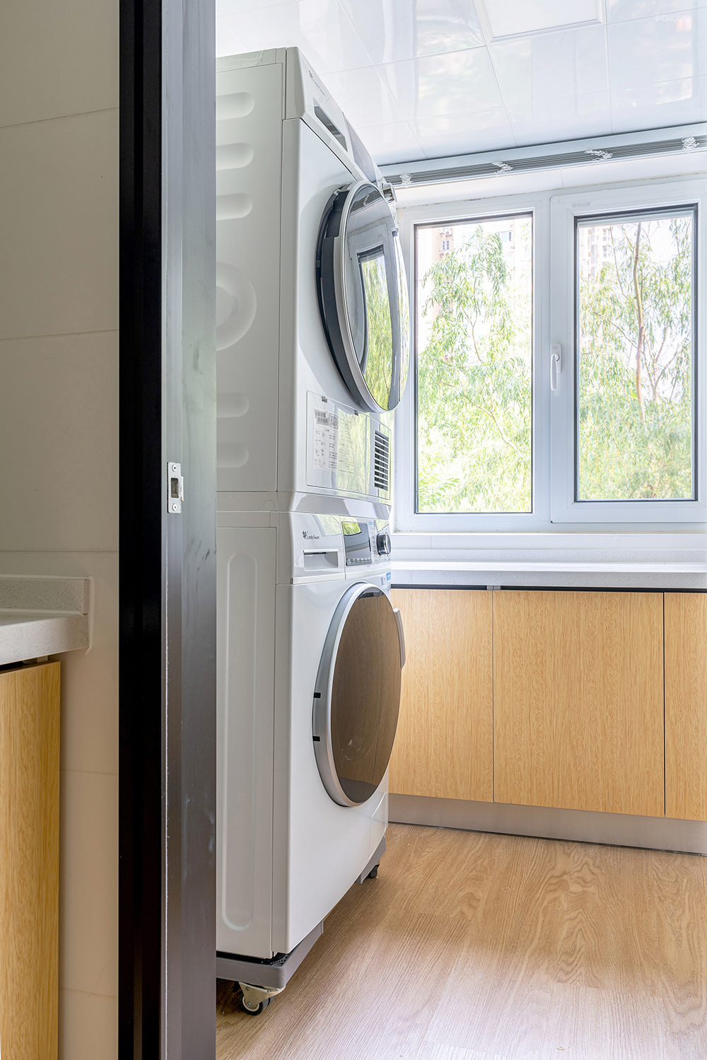 3米长的一字型橱柜,在功能性以及操作动线上都十分的合理。由于是石塑地板,其具备耐污和防水的特性。所以在地面选择了通铺,增加整体空间的延展性。
