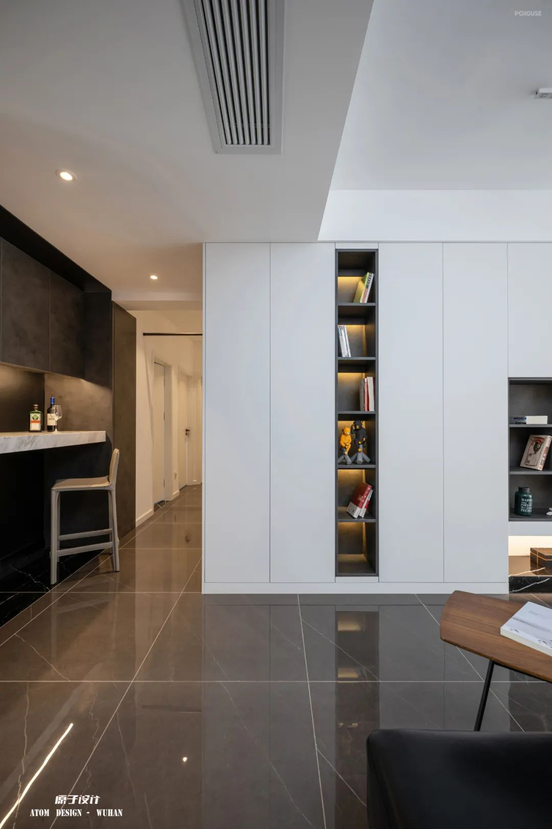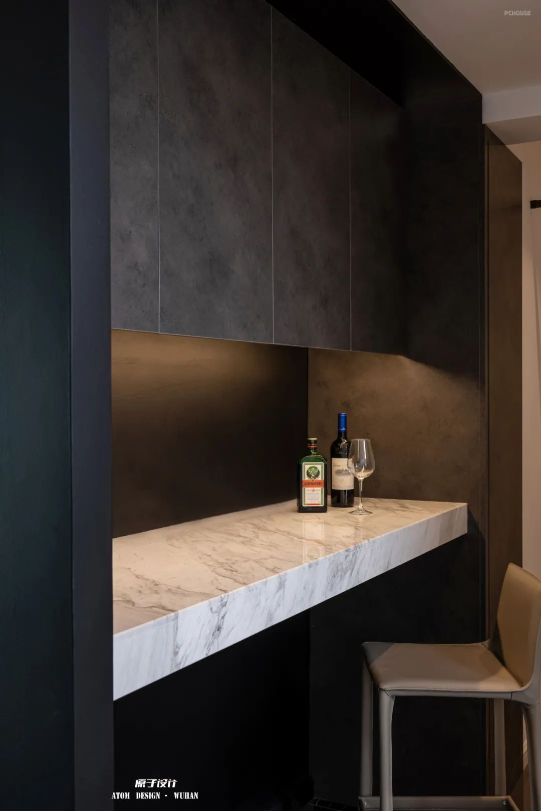咖啡吧台整体颜色和材质与客厅墙柜相互融合且不突兀。