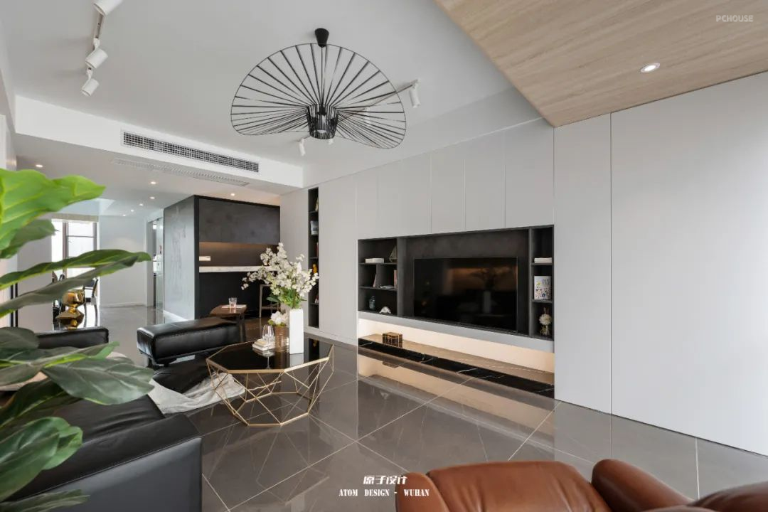 现代与简约融合,精致的空间体现于材料的灵活搭配,白色整面嵌入式收纳柜设计满足了电视背景墙收纳柜多样性,同样材质的隐形门可进入阳台,很好地隐藏了洗衣房和晾晒区。