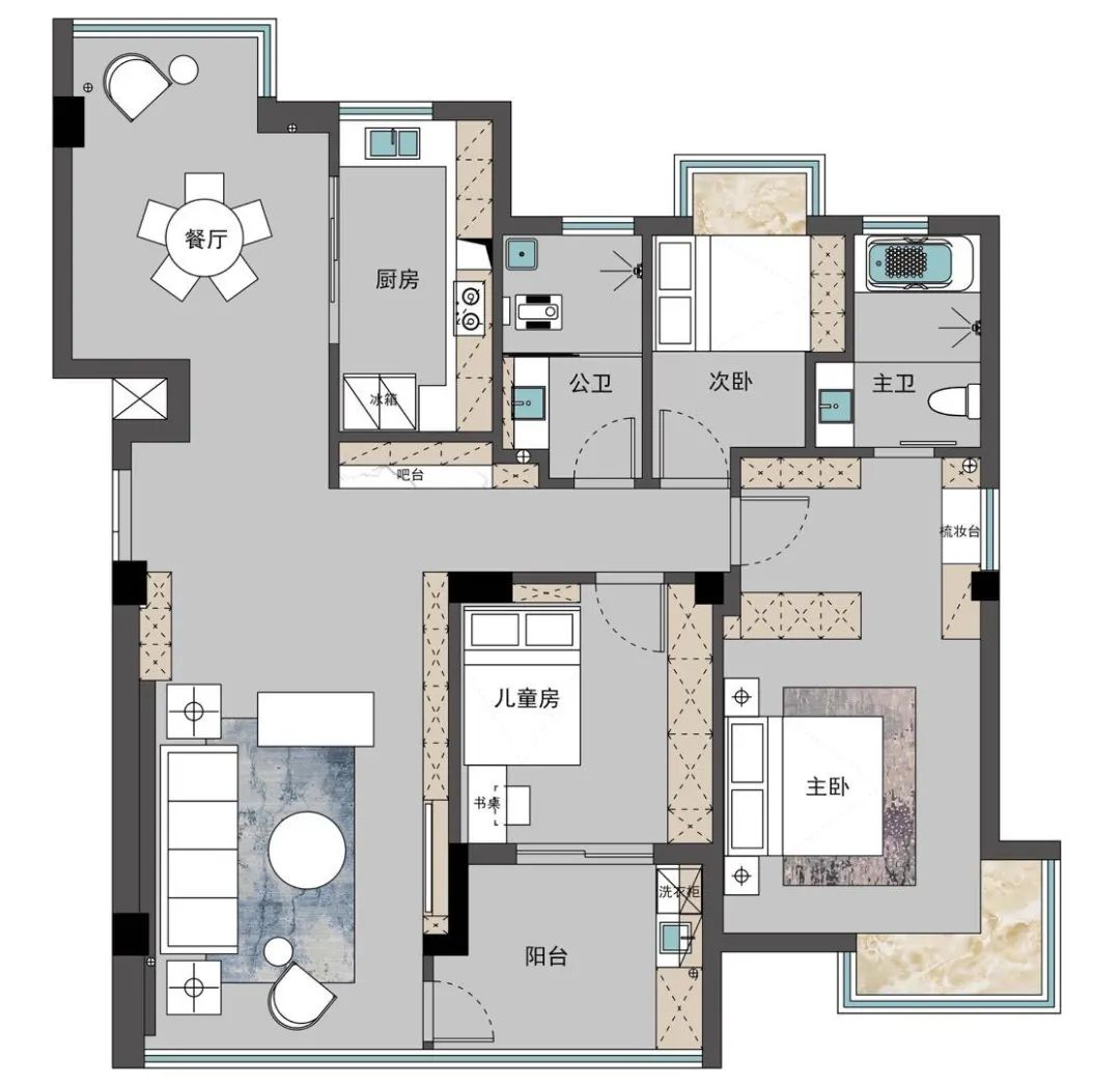 4、主卧室安排过道式衣帽间,满足更多收纳需求,同时设计梳妆台