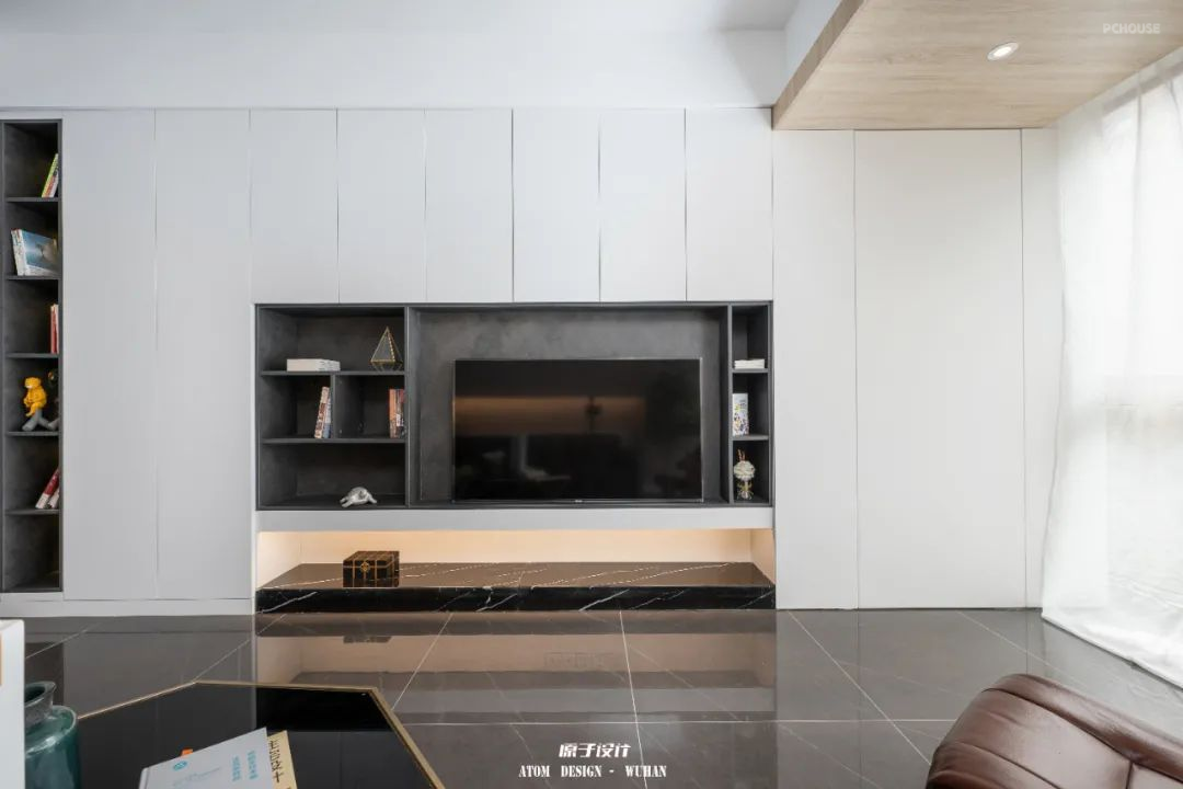 电视背景柜保留部分开放留空隔层,设计得简洁且实用。