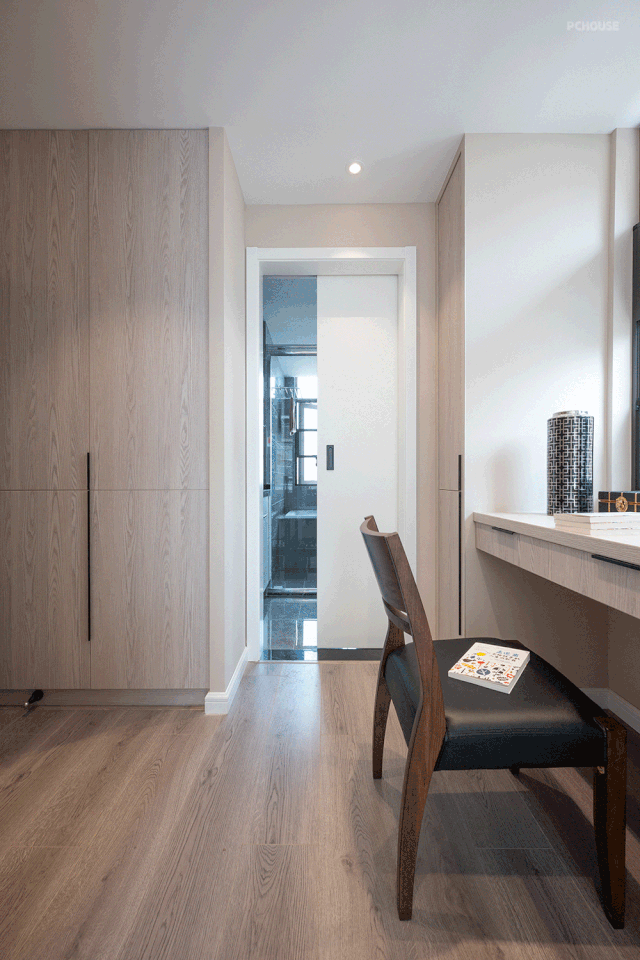 5、主卧室设计了过道式衣帽间,满足更多的收纳空间,同时拥有写字桌和梳妆台的功能