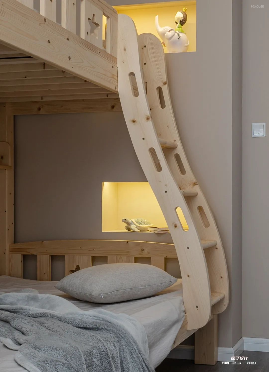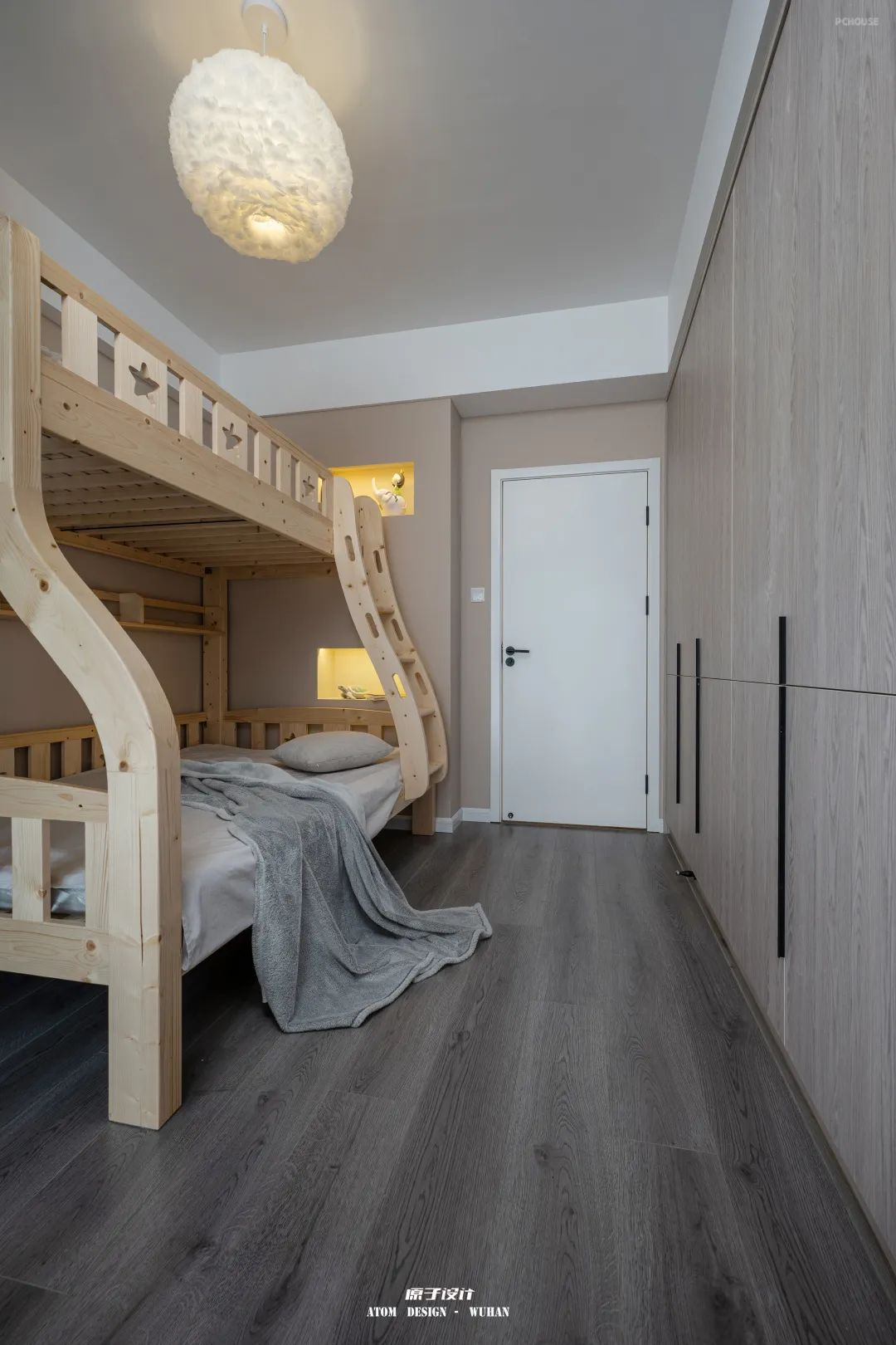 上下两个壁龛,让未来两个小朋友都有各自独立的收纳空间可以摆放一些小秘密和收藏,亮着壁龛灯读睡前小故事,说说彼此的心里话,都是我们美好的童年回忆。