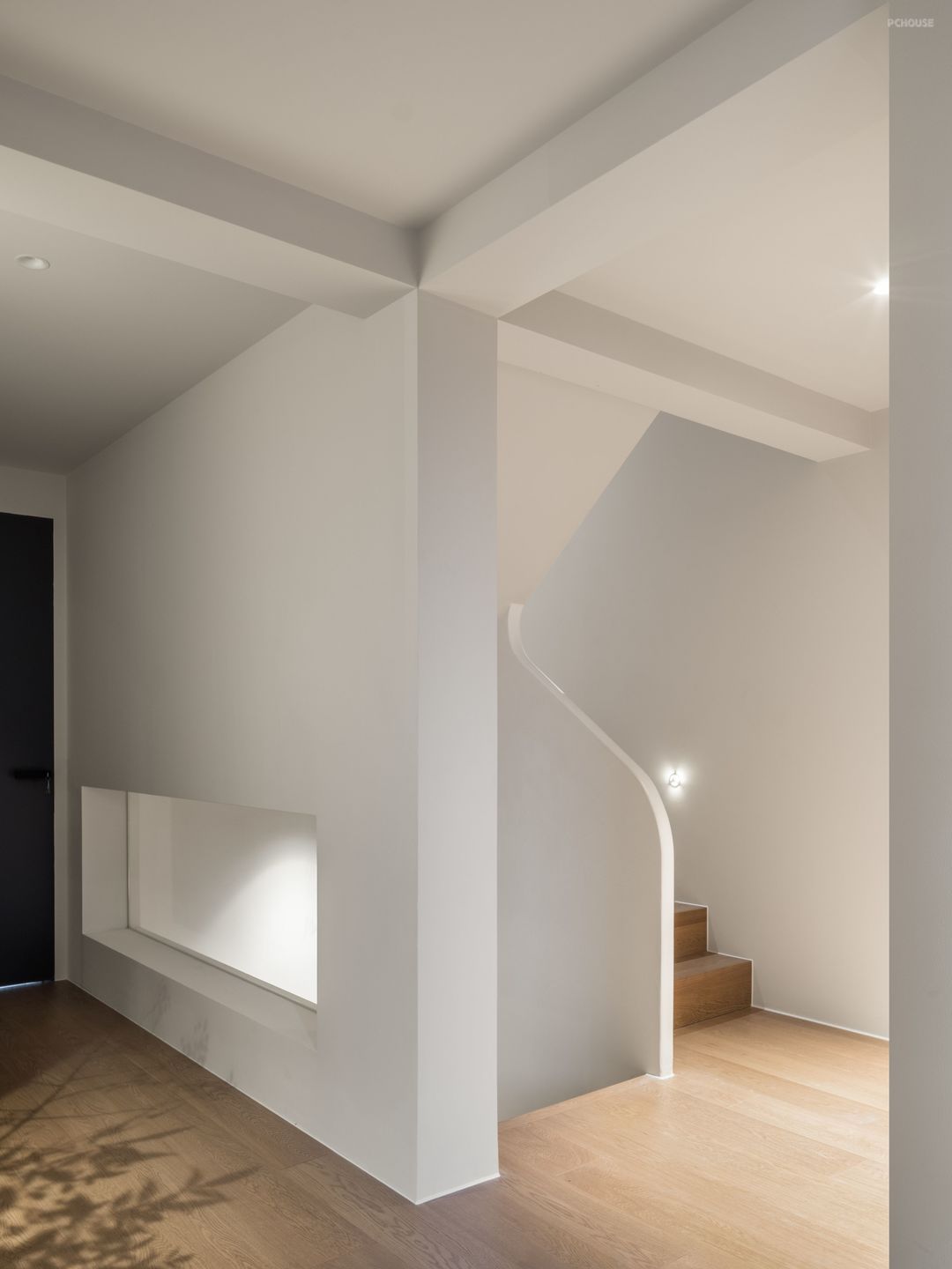 在整体空间和楼梯过道的处理上,我尽量让原有的梁柱结构裸露出来,保持建筑原有的高度,把层高留给最重要的空间感,楼梯扶手是木工师傅现场按我的要求一点点手工做出来的,成品出来的效果却意外的惊喜,全屋无踢脚线的工艺,白色微水泥的踏步和艺术漆的扶手都是平时不敢给甲方用的,因为确实不太好打理,无奈真的很美,算是我对追求美的一种妥协。