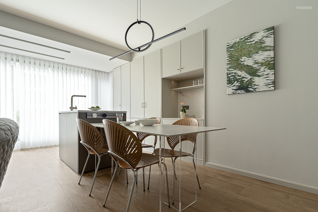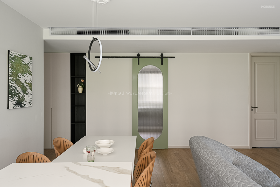 The overall color is reminiscent of the texture of puree and cream, and the air is brewed with fresh, soft and natural flavor. The guest restaurant has a large area, and the TV background wall is designed with color contrast and asymmetry. On one side, it is framed with ivory gypsum line carved corner flowers, and on the other side, it is in the shape of low-saturation avocado green fence.