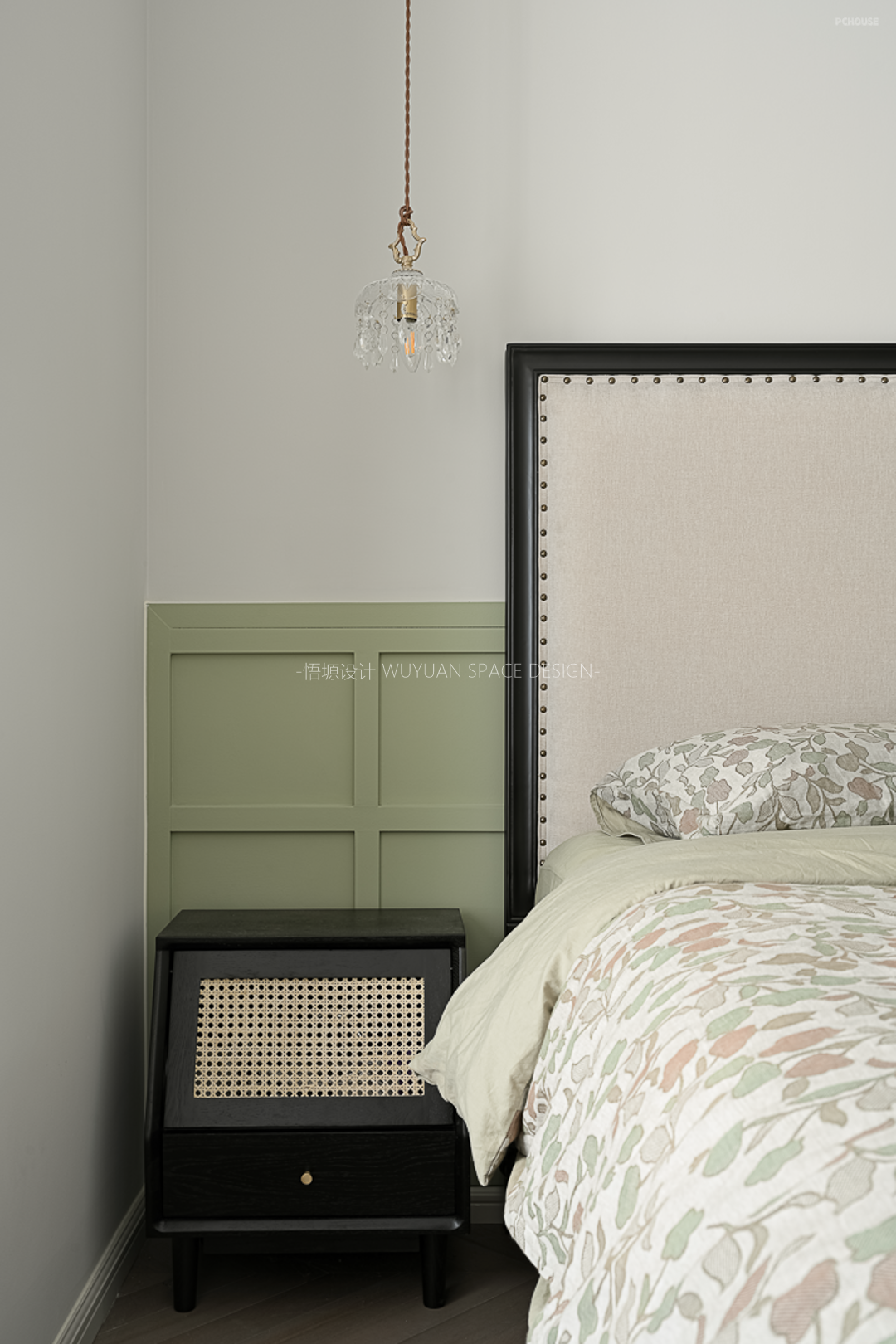Reduce the saturation of avocado green, match with the shape of the wall panel, modify the level of the bedside background, jump to the direction of the cabinet, narrate the color rhythm, decorate the dark frame, and blend the romantic poetry on the low, medium and high narrative lines.