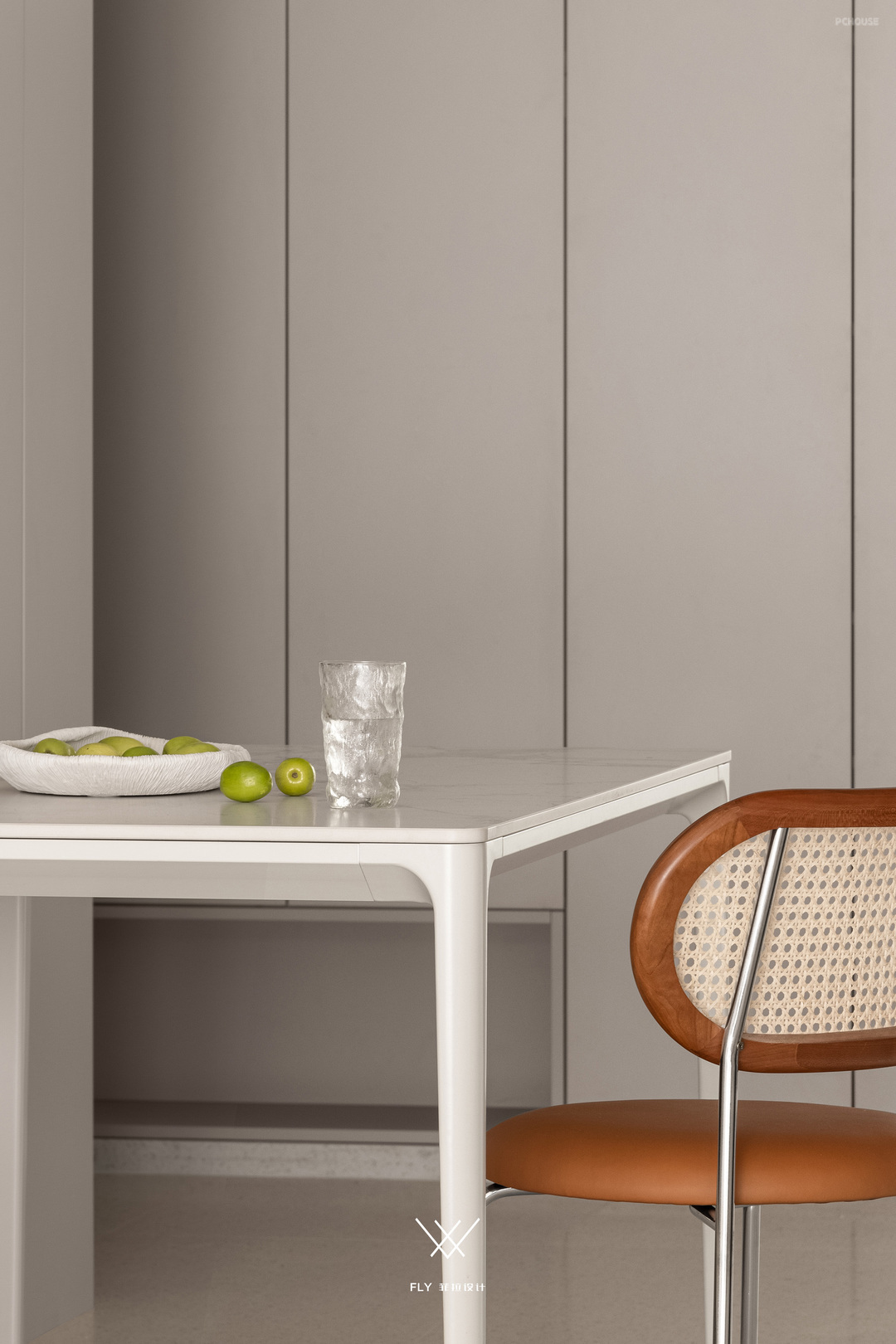 结合了空间位置、区域感受、收纳需求这三个特点,便有了现在的餐厅形式。整个餐厅我们靠近一侧墙体来做,这样就不会占用主动线的空间,整个家里面行动路线是流畅、不受阻的。贴着餐厅这一侧墙做了一大面柜体充当餐边柜强化收纳功能,当然也可以作为其他收纳需求的补充。然后中间留有放两人位的卡座。