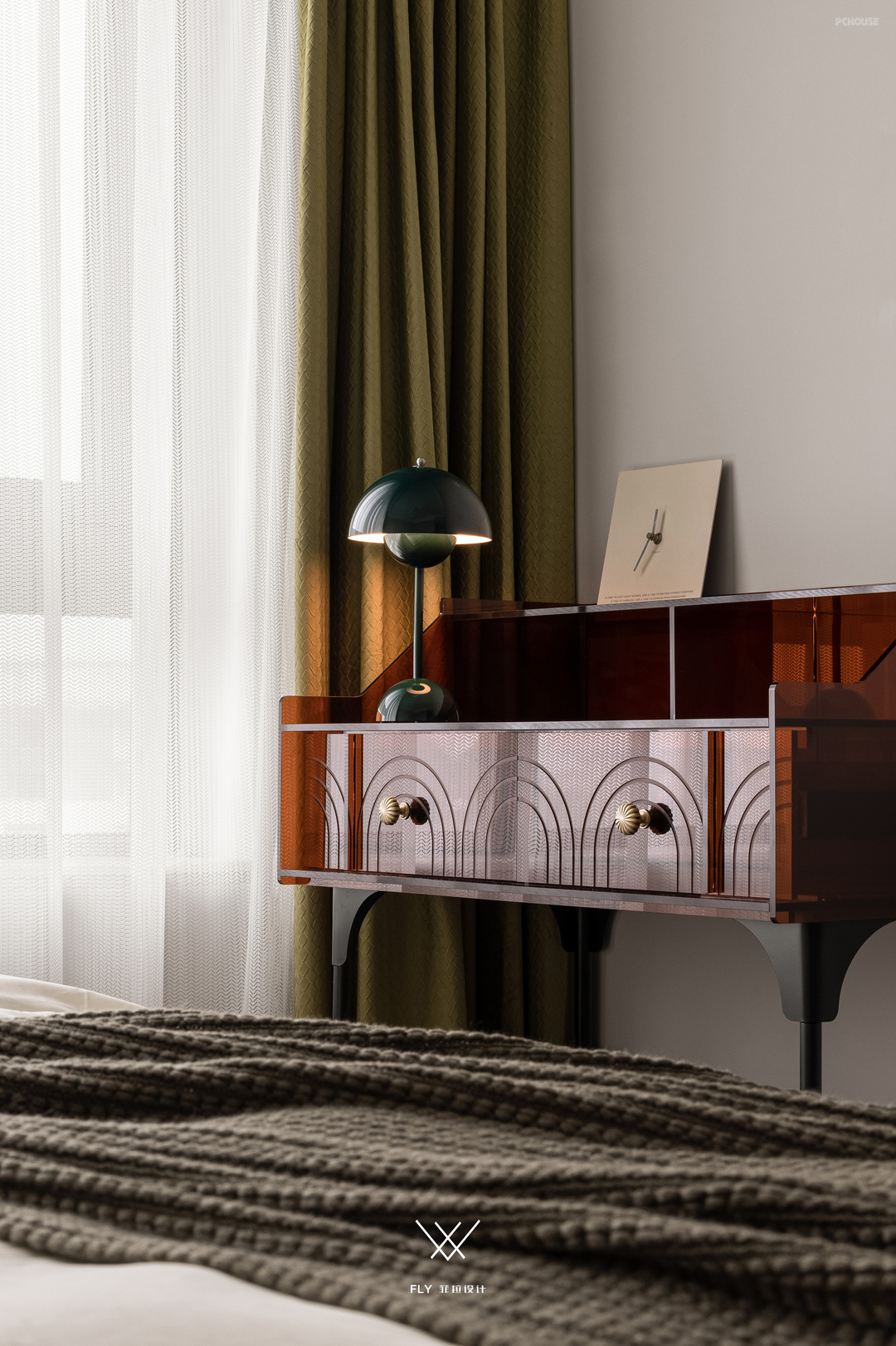 床尾靠墙靠窗的位置放置梳妆台,亚克力的材质,在阳光的照耀下更加漂亮通透,颜色以及款式都是让人挪不开眼的一款,线条克制从容,尽显优雅~
