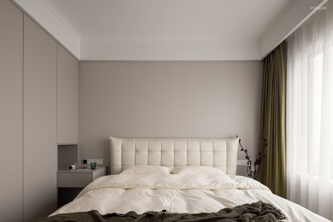 左侧床头柜我们做的是与柜体穿插的结构形式,悬浮状在视觉上不占空间,希望卧室可以多一些轻盈感,平衡好生活中的功能需求与舒适感。