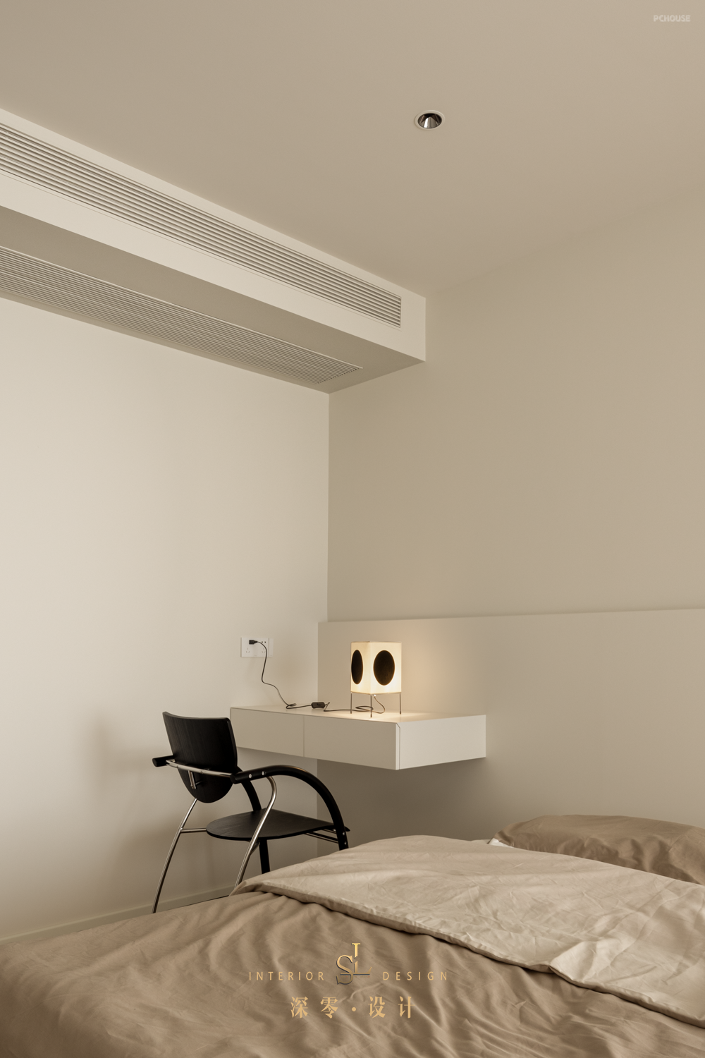 床头背景墙做半墙设计,突出层次感,搭配无床头和悬空桌,把简与功能结合,还能减轻清洁负担;另一侧吊柜+边几供睡前置物,打造简单舒适的入睡氛围!
