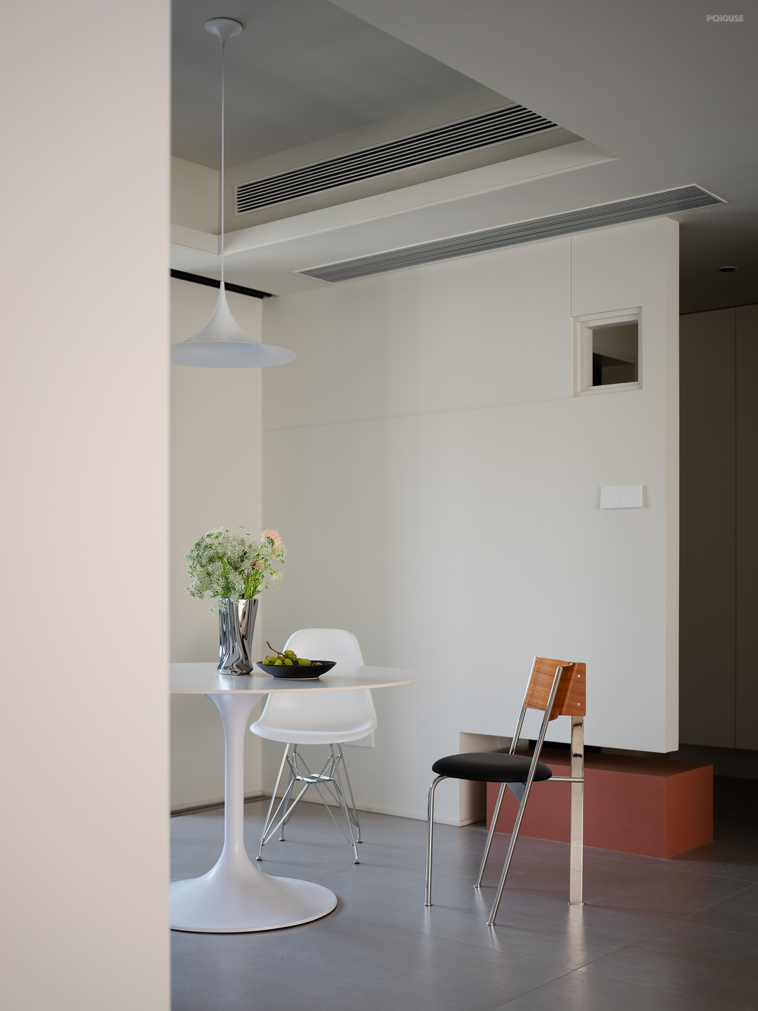 新建入户隔断墙,使玄关相对独立,避免开门便一览无余。红色体块兼做换鞋凳,独立于墙体,与上方镂空造型一起,带来视线的错层、穿透,为玄关带来通透感。