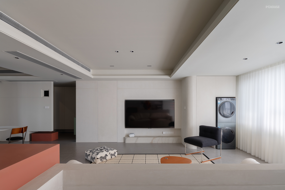 屋主喜开阔、利落,电视背景墙借助艺术漆与裸板,统一面层。利用抽缝修饰,与餐厅隔墙呼应,也使儿童房的隐形门效果更自然。电视下的小地台,表面利用艺术漆做出石材纹理,实现圆弧的细节。
