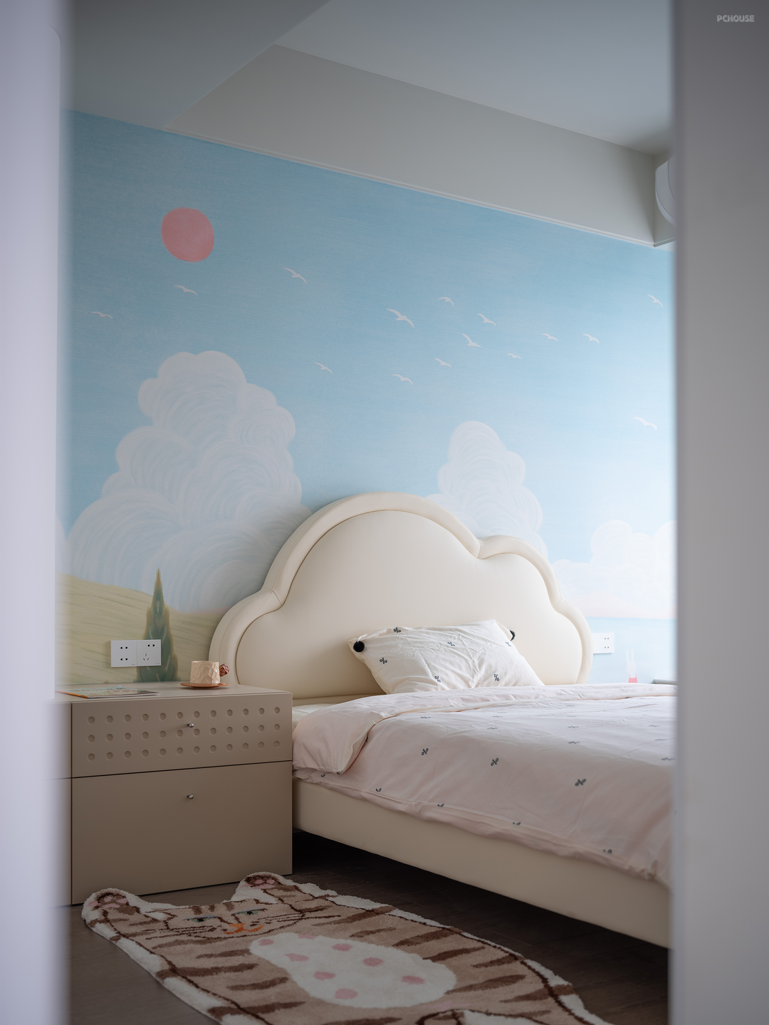 自然风壁纸、蚕丝吊灯,棱角圆润可爱的星星把手,撞色柜体,修饰起现有的每一个细节,不赘余物,营造舒适自然的童趣氛围。