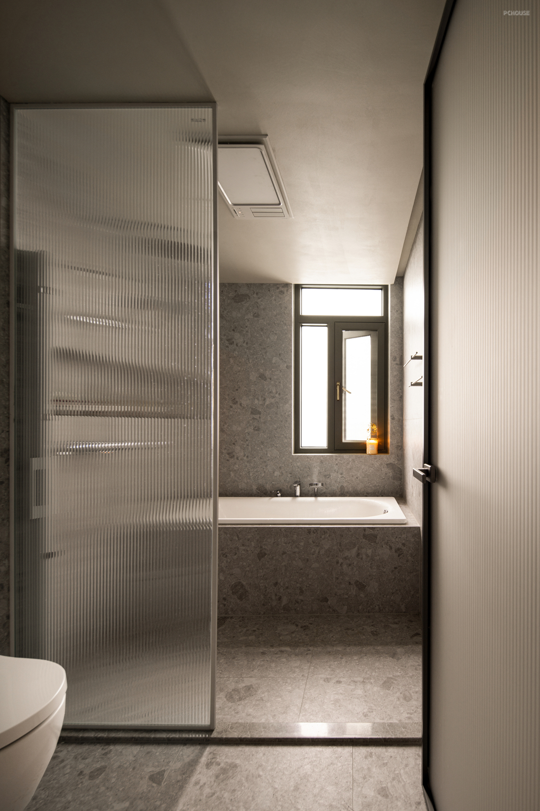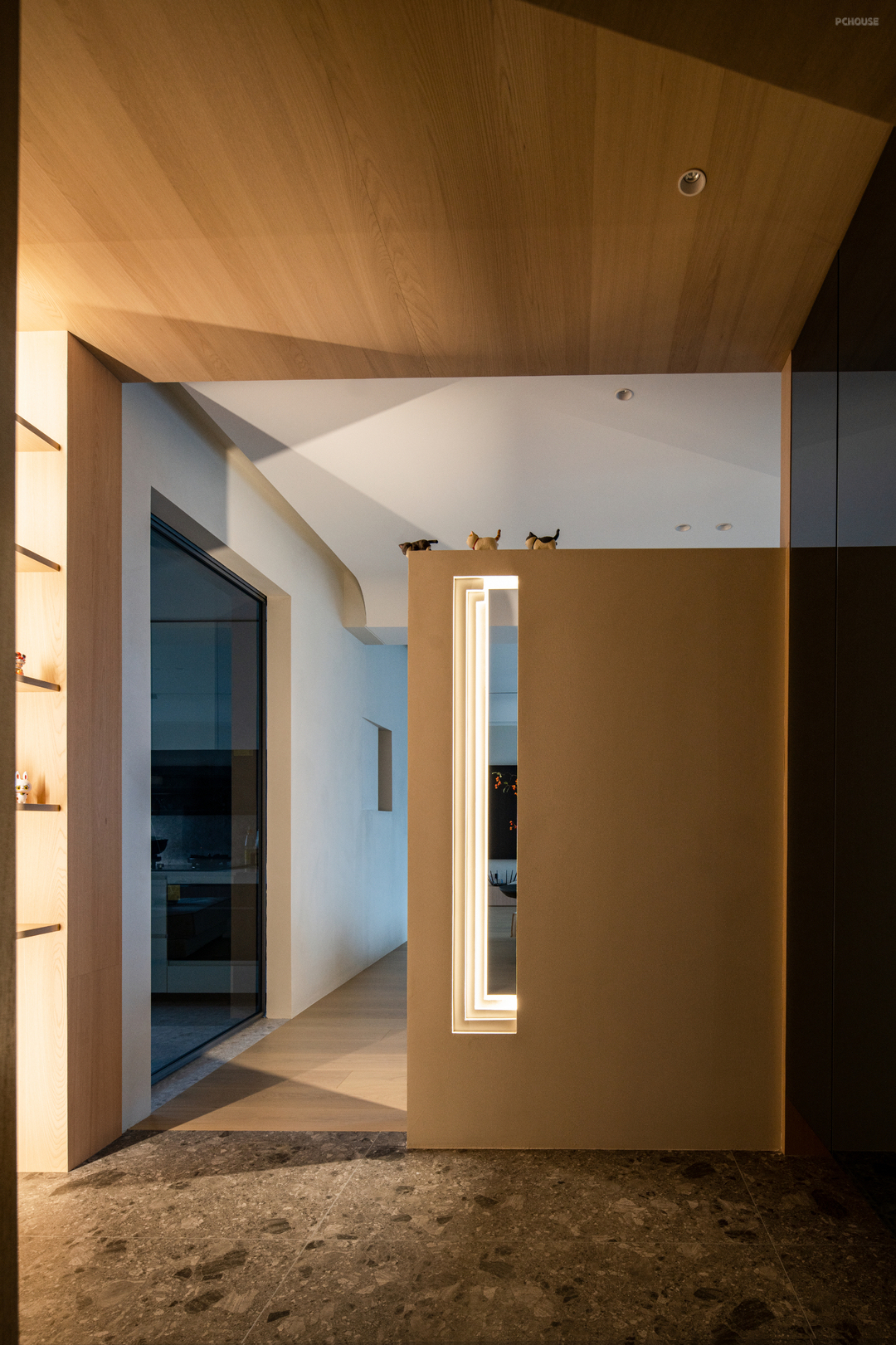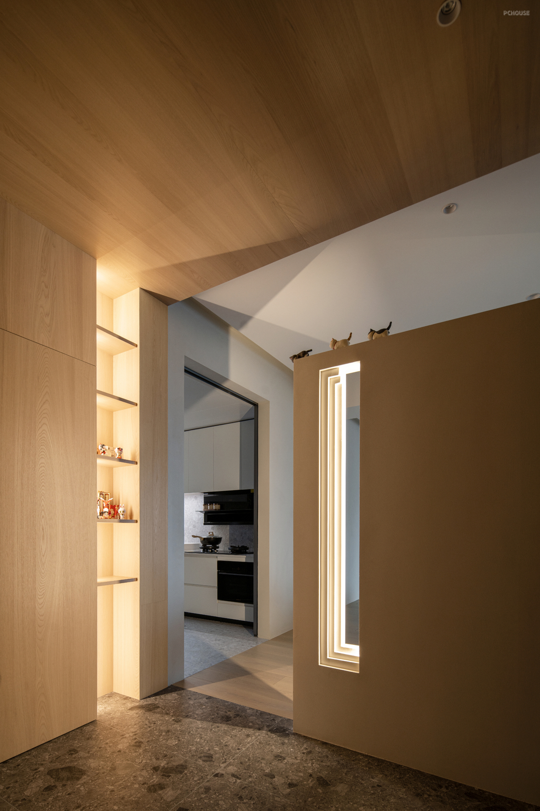 长墙上的开洞造型与玄关呼应,同时解决卫生间干区采光通风的问题。