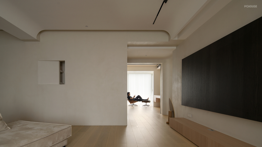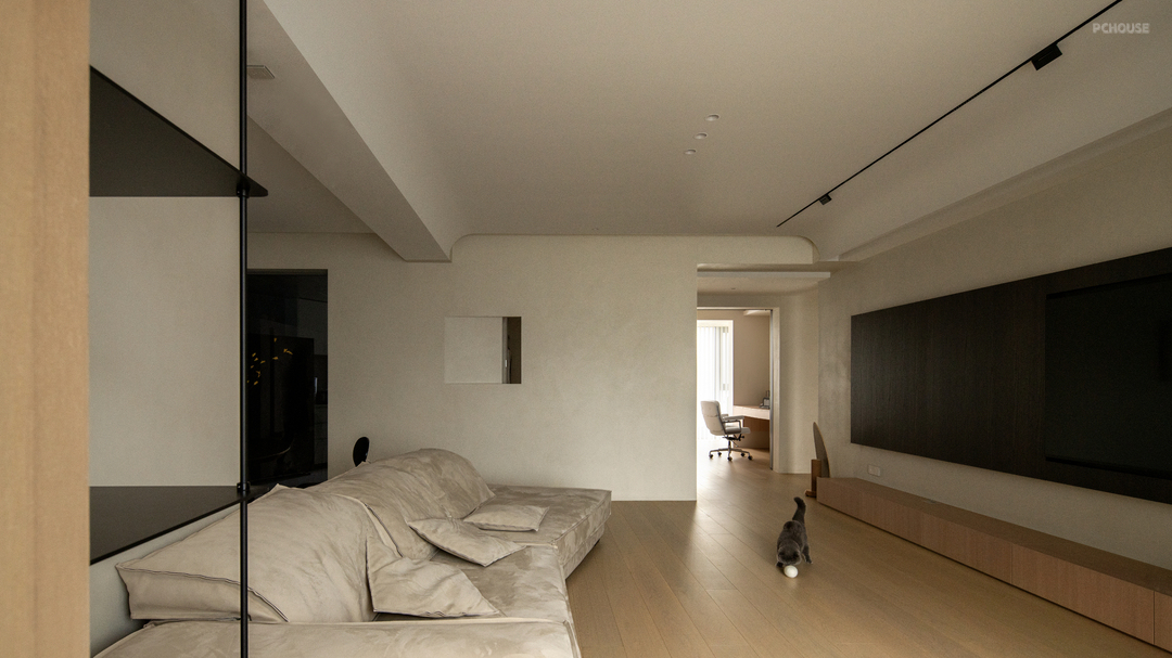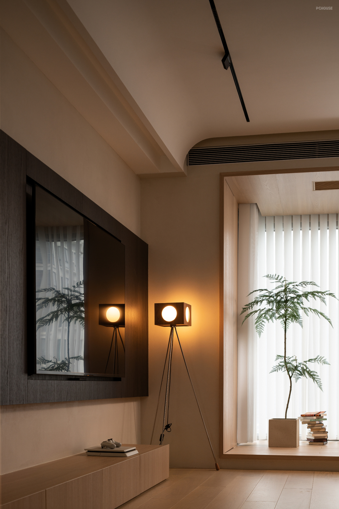 电视背景墙:黑色木纹板+落地抽屉柜,简单错落的造型平衡长墙比例,拉伸视觉让客厅空间更轻薄。利用弧形吊顶空间预留投影幕布槽,让日后多一个观影选择。