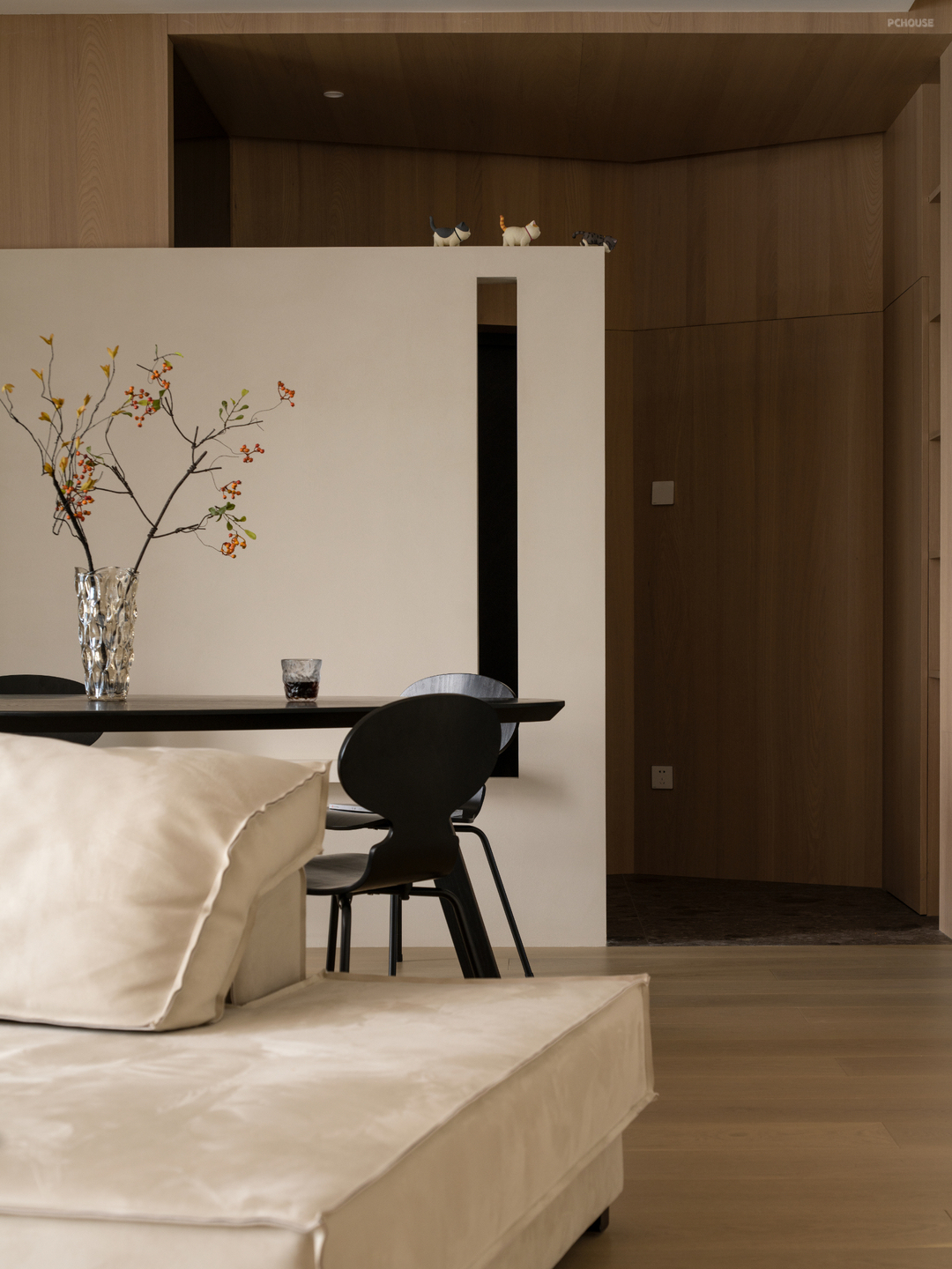 共用玄关造型,结合原始异形结构形成类似屏风的概念,不规则的桌子给整个方正空间多一丝趣味。