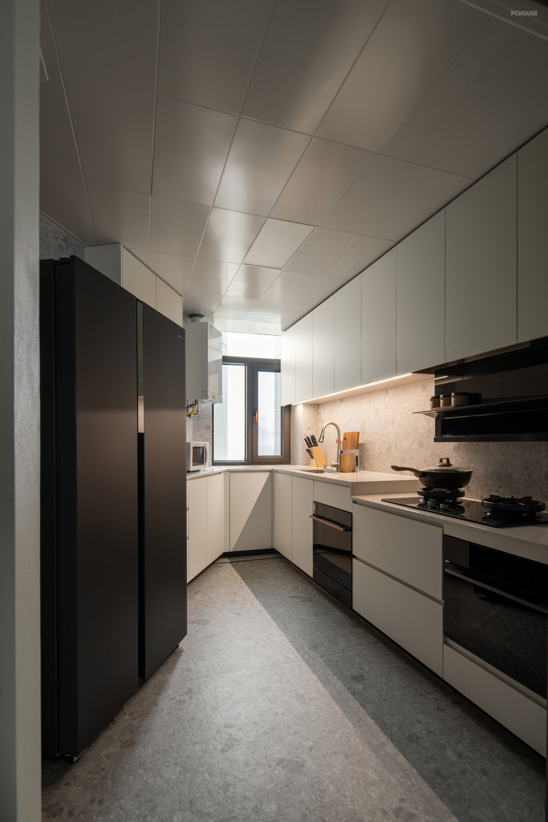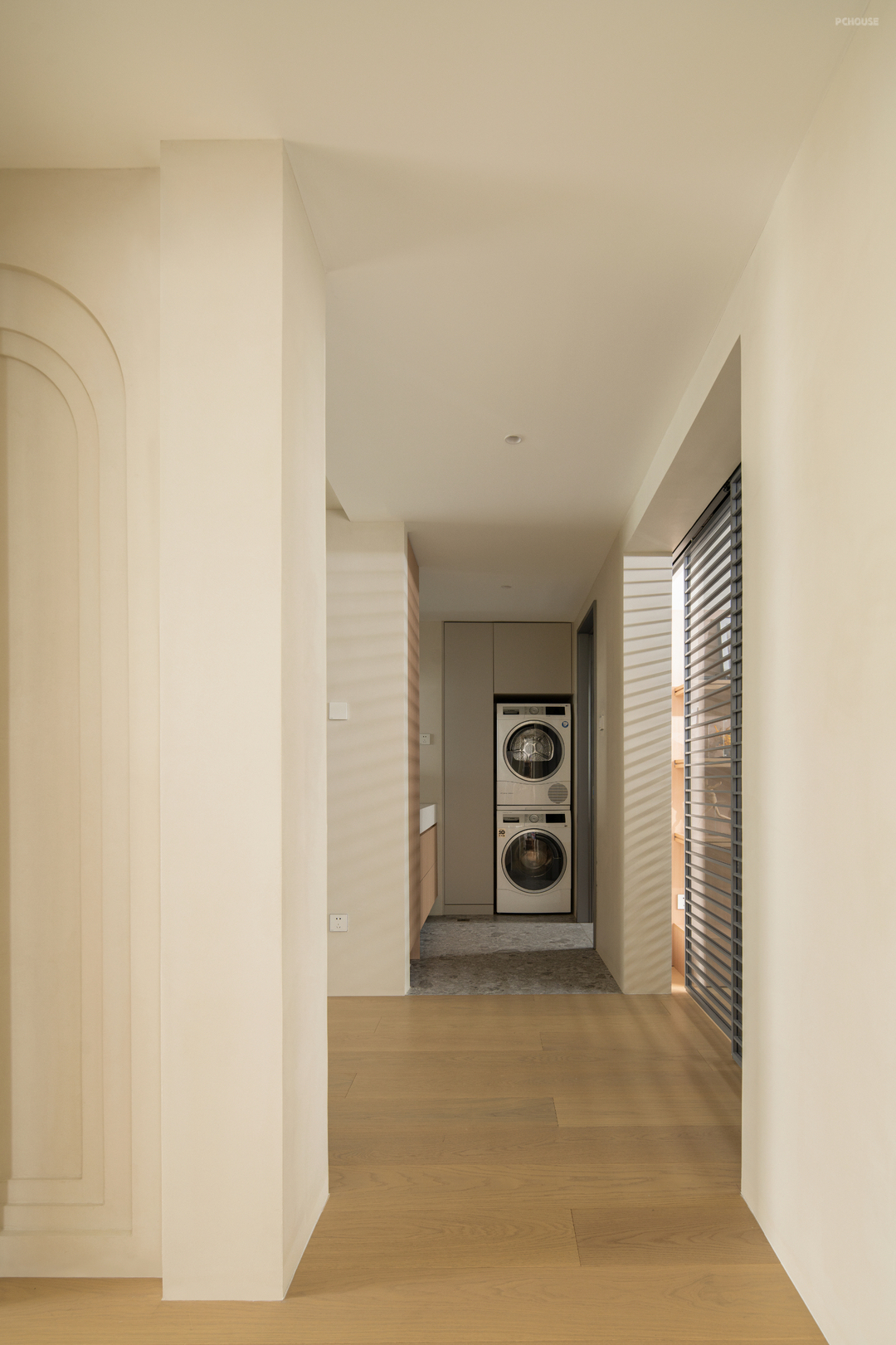 将北面阳台包入室内,顶面吊顶隐藏一个嵌入式电动晾衣架,方便临时的晾晒需求。