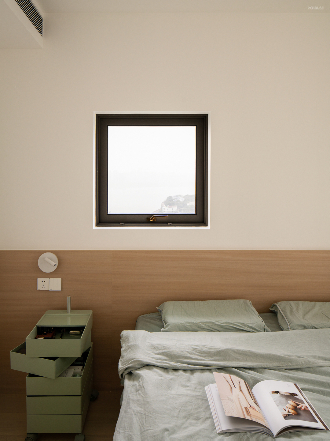主卧原床头上方的窗户老旧,占位不好,我们把室内窗框改成正方形画框形式,想以画中画的概念,将窗外的景色作为室内的装饰。