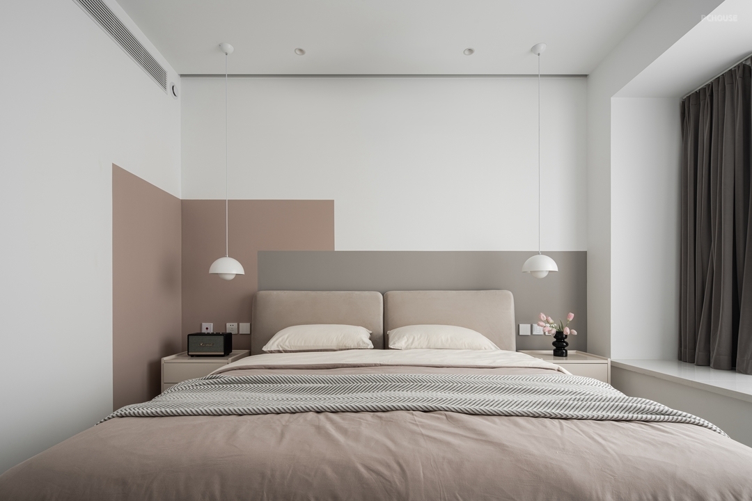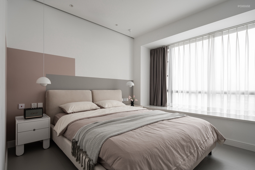 灰与粉的搭配,带给主卧温柔的氛围感。