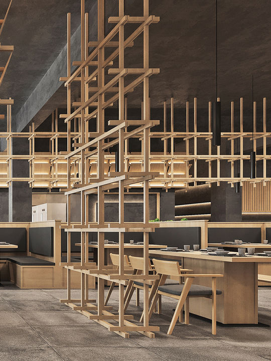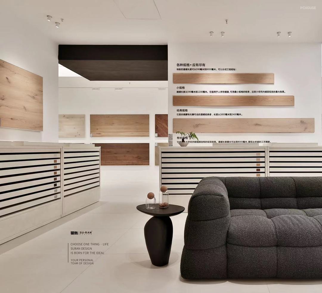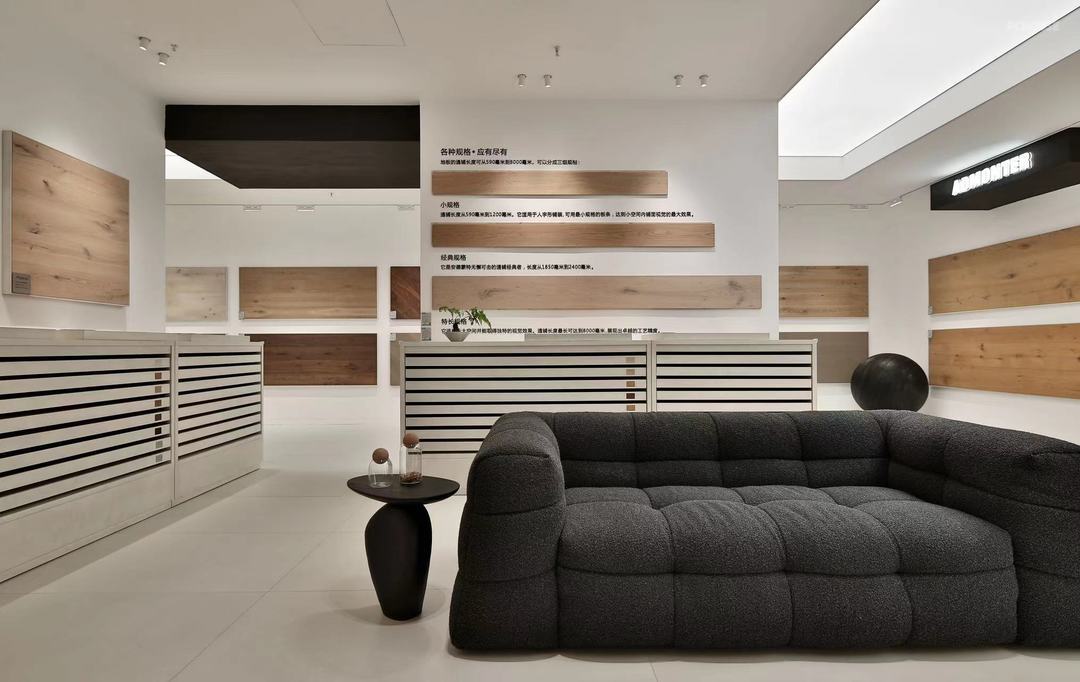 空间是包容着物体的边界,是静止的容器。当我们需要一个展示木地板的空间的时候,我们营造的是一种氛围。在前侧围合的边界设计了双开门洞,客户可以双侧进入,增加空间的趣味,使人愿意停留,同时作为内外的过度。