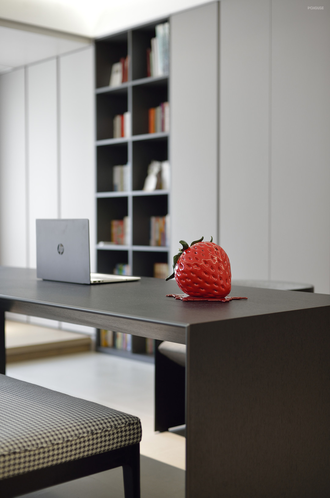 床头柜的草莓摆件是艺术家周松的作品,是我们在北京798出差的时候相中的,放在黑白灰的空间里很出彩。