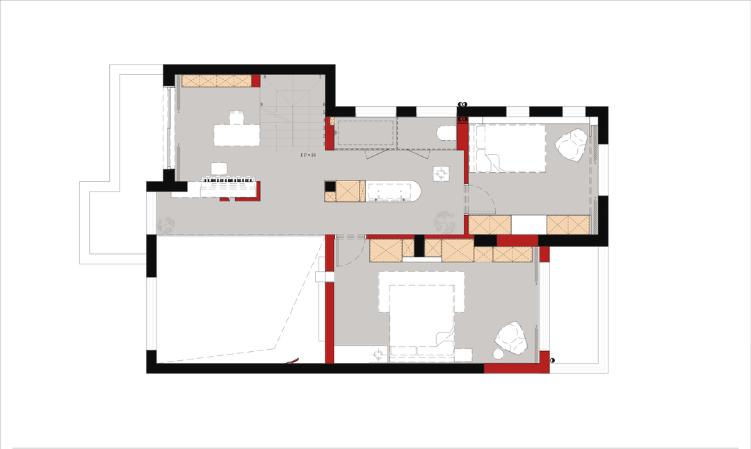 二层 1.楼梯改动后占据部分次卧面积,将剩下部分改造为开放式书房及练琴区,同时也利用挑空结构与一层形成互动,增强空间联系; 2.原楼梯并洗手间及储物间,整合为长辈房,使用面积增加,入住使用感更为舒适; 3.扩大走廊空间,并利用三分离式布局,将洗手间与走廊相结合,既满足功能需求,也保证了二层开放空间的开阔视野。