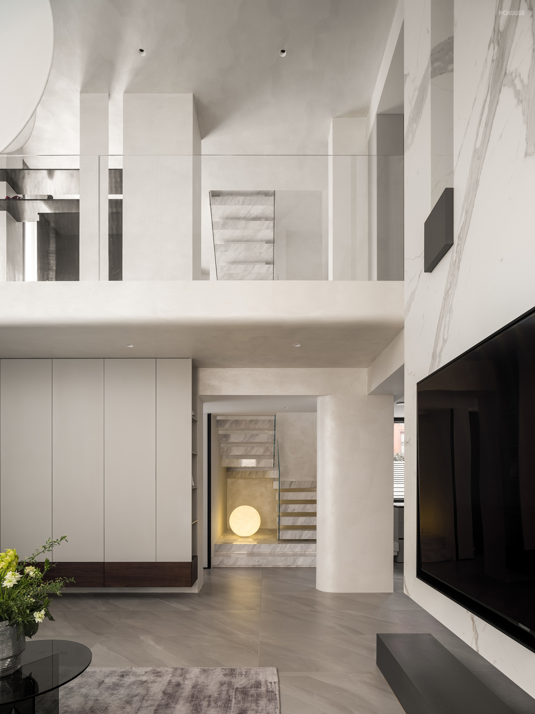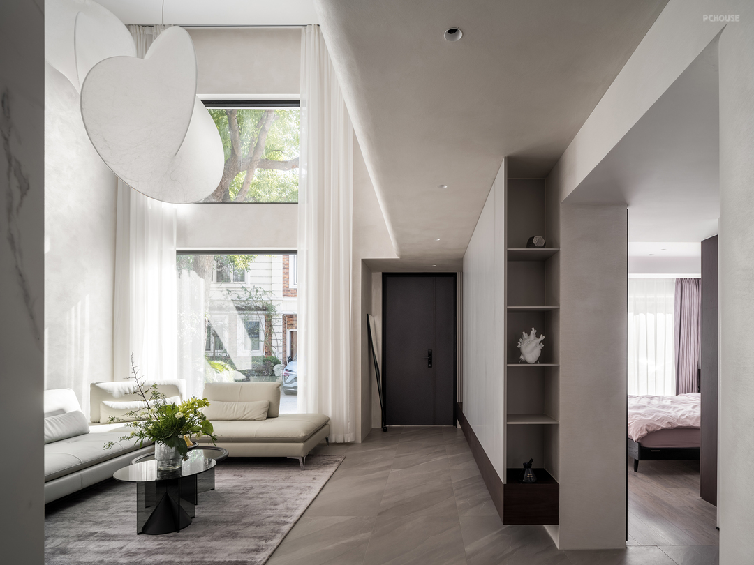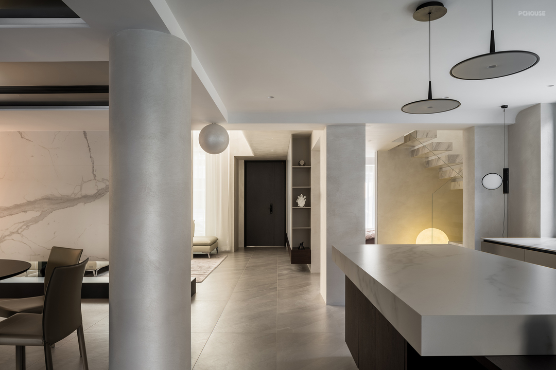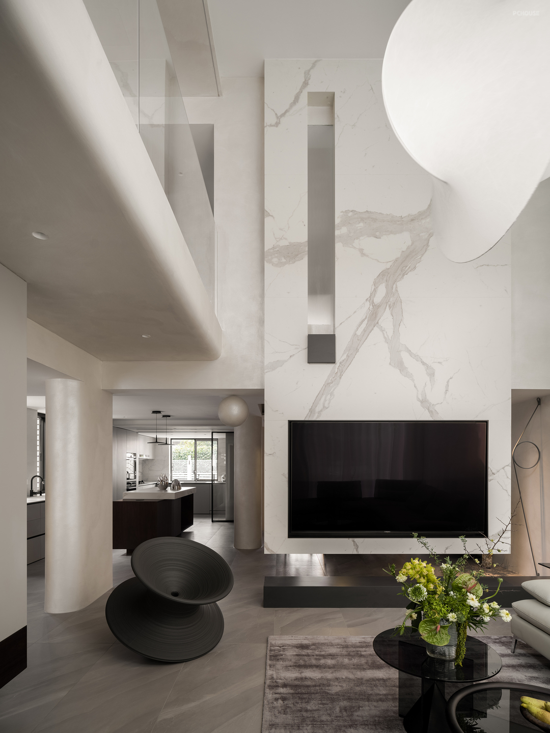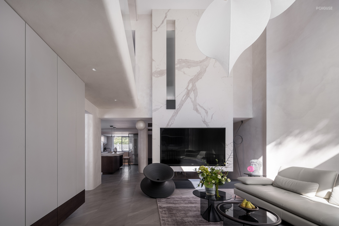 纯粹、自然的底色将空间勾勒出温柔宁静的气质,近6m的层高呈现出强烈的空间感,置身于其中感受到“自我的渺小”从而更能体会到心境上的开阔与放松。背景墙虽为纯色,但于设计上略作修饰,以曲边截面加深平面背景墙的立体感,视觉上与层高更为契合。 平面吊顶的设计在别墅里或许会略显单薄,但在FLOS独特造型吊灯的修饰下,与此间平和舒缓的空间气质搭配得宜,恰到好处。 #客厅 #电视背景墙 #沙发 #吊灯