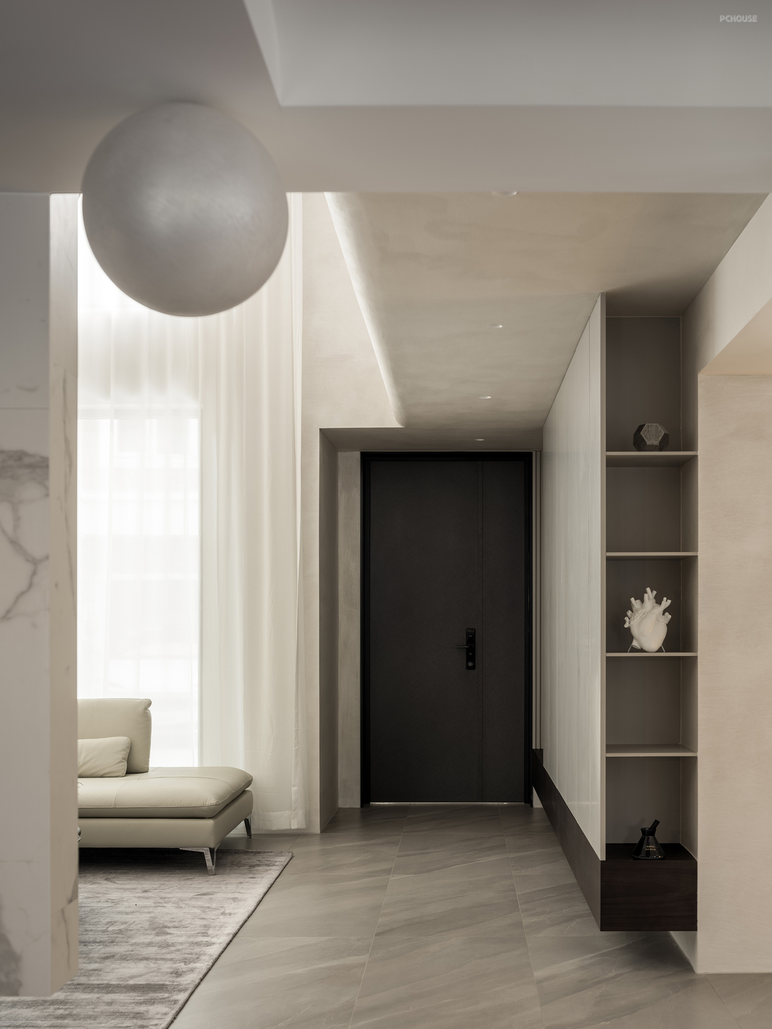 于入户左侧墙面定制通高墙柜,纯白无把手柜面与下方实木台面结合,呈现简约自然的视觉效果,底部悬空设计,打破通高柜体的沉闷,更显轻盈。侧面保留一组开放格,用以展览藏品,修饰空间,彰显典雅大气之感。 #玄关 #玄关柜 #收纳柜 #吊顶