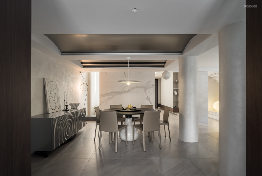 吊顶的设计比较特别,为了提升视觉层高,非承重梁体部分尽可能保留高度,同时采用金属曲面作为装饰,过渡梁体的突兀感,让其整体观感独特且自然,同时也通过不同元素及层次的叠加,减少层高不够带来的压抑,兼顾艺术性与实用性。 #餐厅 #餐桌 #餐椅 #吊灯 #吊顶