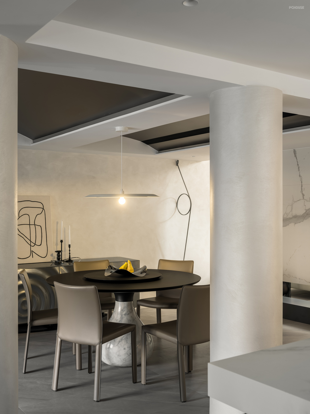 餐厅采用全开放式布局,承重柱选择用曲面包裹修饰,避免日常活动中的磕碰,也在视觉上契合空间气质,圆形餐桌更具有团圆幸福的意味,符合屋主一家三代五口人的居住情况,也与承重圆柱相呼应,构筑大气团圆的用餐氛围。 #餐厅 #餐桌 #餐椅 #吊灯 #吊顶