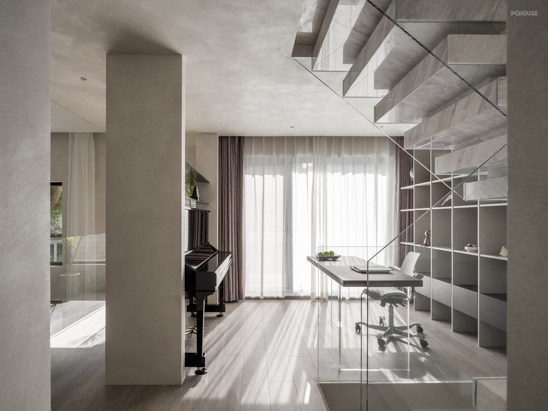 楼梯位置改动后,原卧室一分为二,剩余部分改造为开放式书房兼练琴区,近挑空区的位置增加了空间的互动感,让家人之间的互动变得更加灵活有趣。二层挑空边缘采用玻璃封层+底部镜面铺贴的设计,从视觉上加深空间纵深感,层理丰富,无论是练琴还是学习,亦或是办公,都能在疲劳时拥有一个适宜放松的好视野。 #书房 #木地板 #书桌 #亚克力